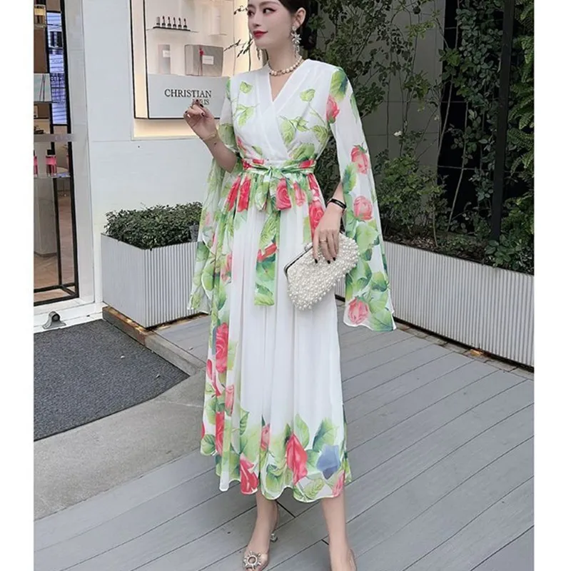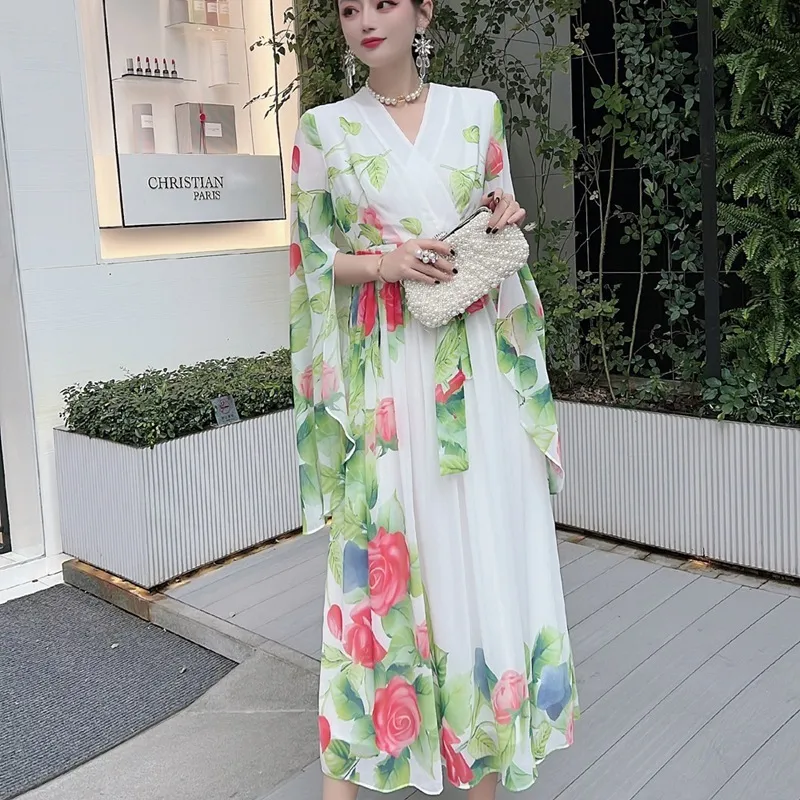 衣都精品- 2023新款歐美復古紫藤花鬆緊腰連衣裙