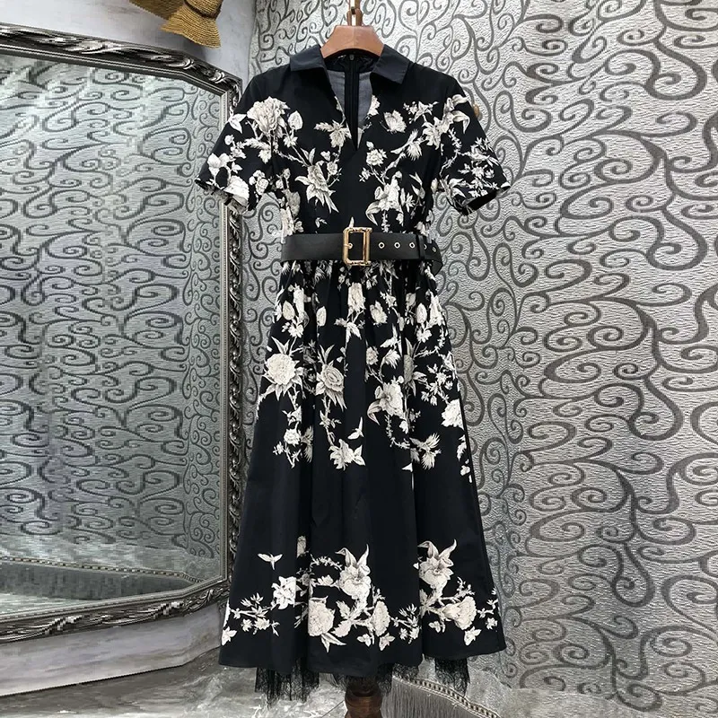 衣都精品- 2023新款網紗拼接印花蕾絲花邊透視連衣裙