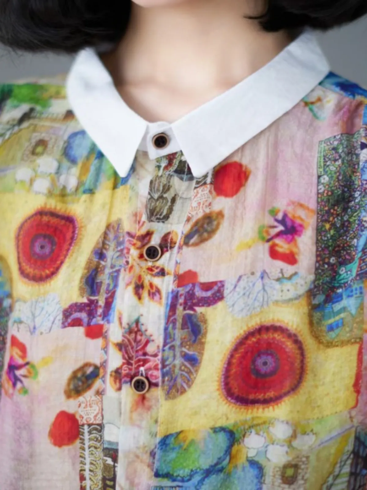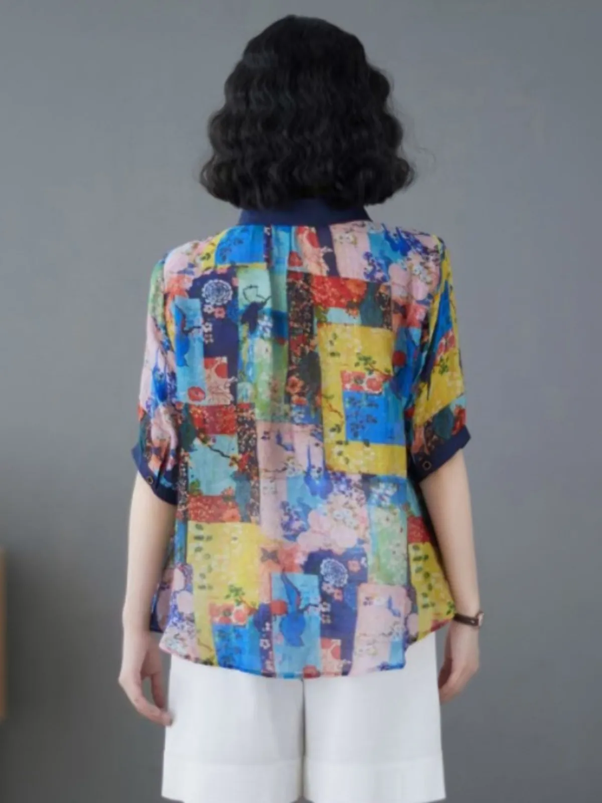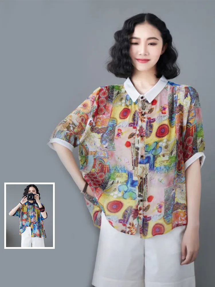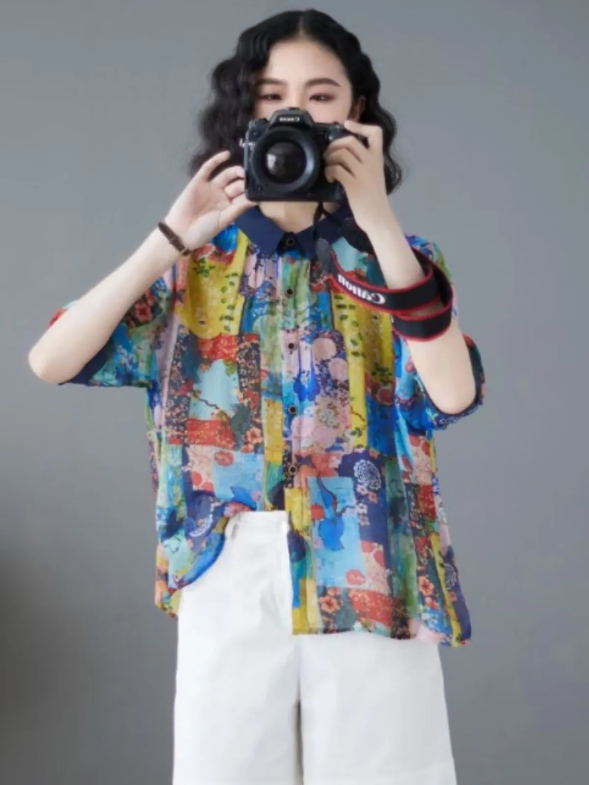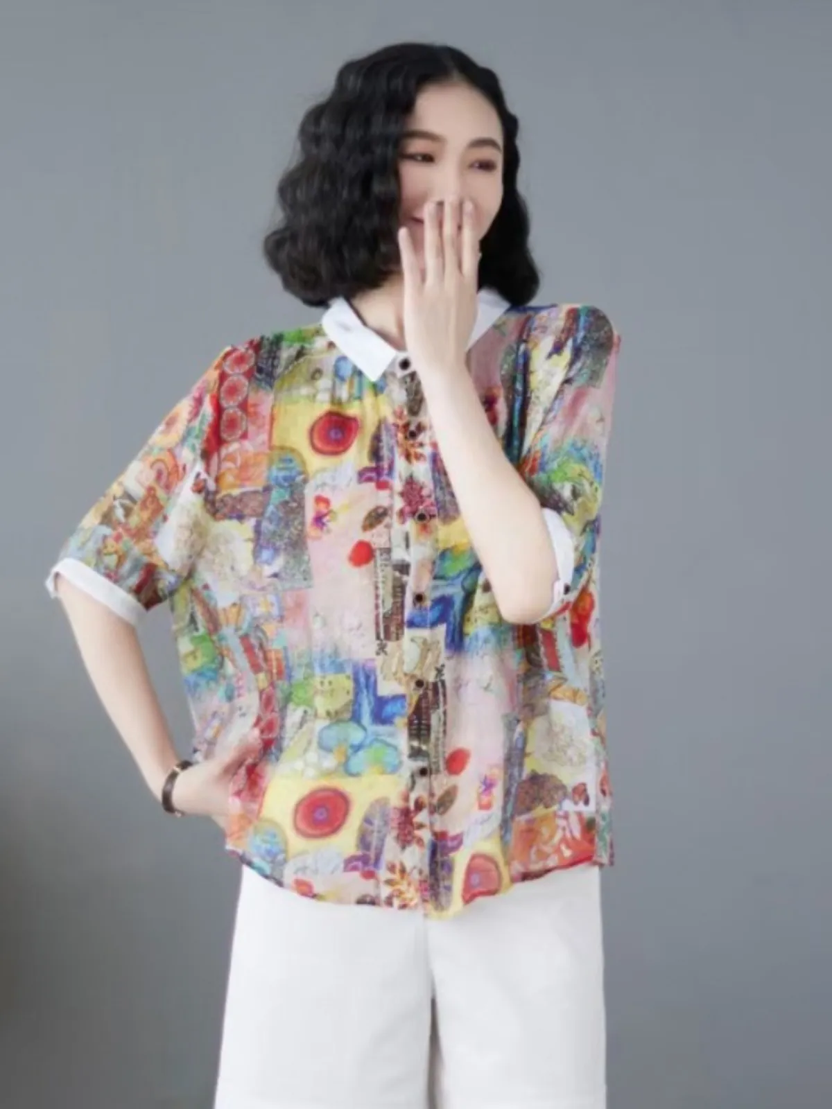 衣都精品- 2023新款拼色翻領不規則減齡上衣