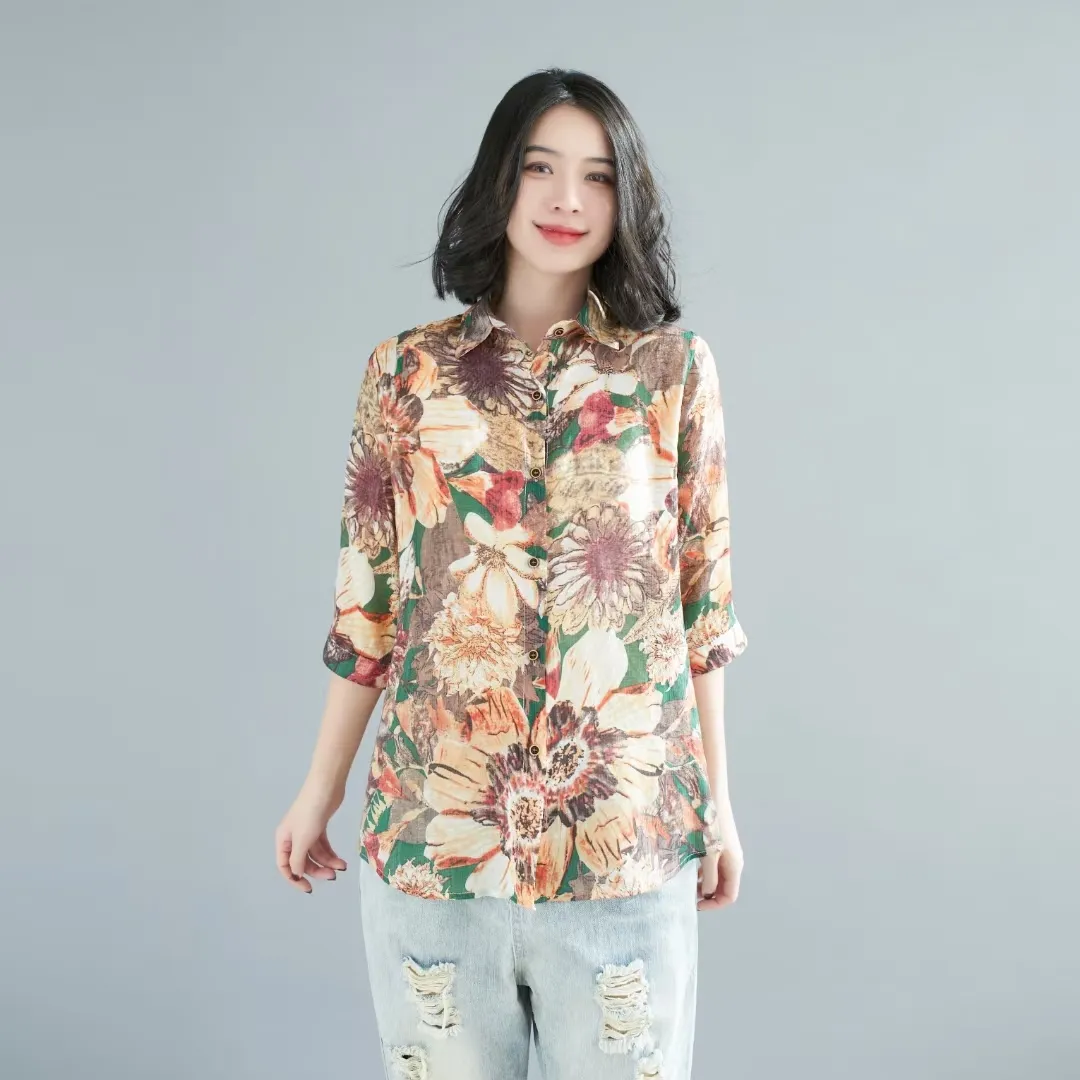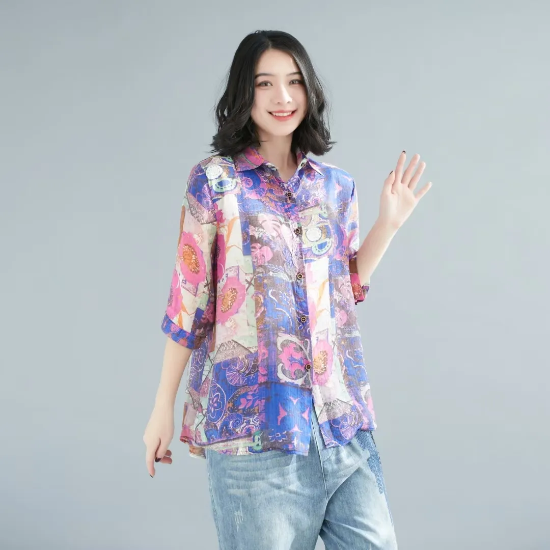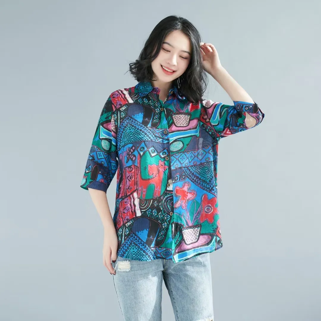 衣都精品- 2023新款復古文藝棉麻印花七分袖上衣