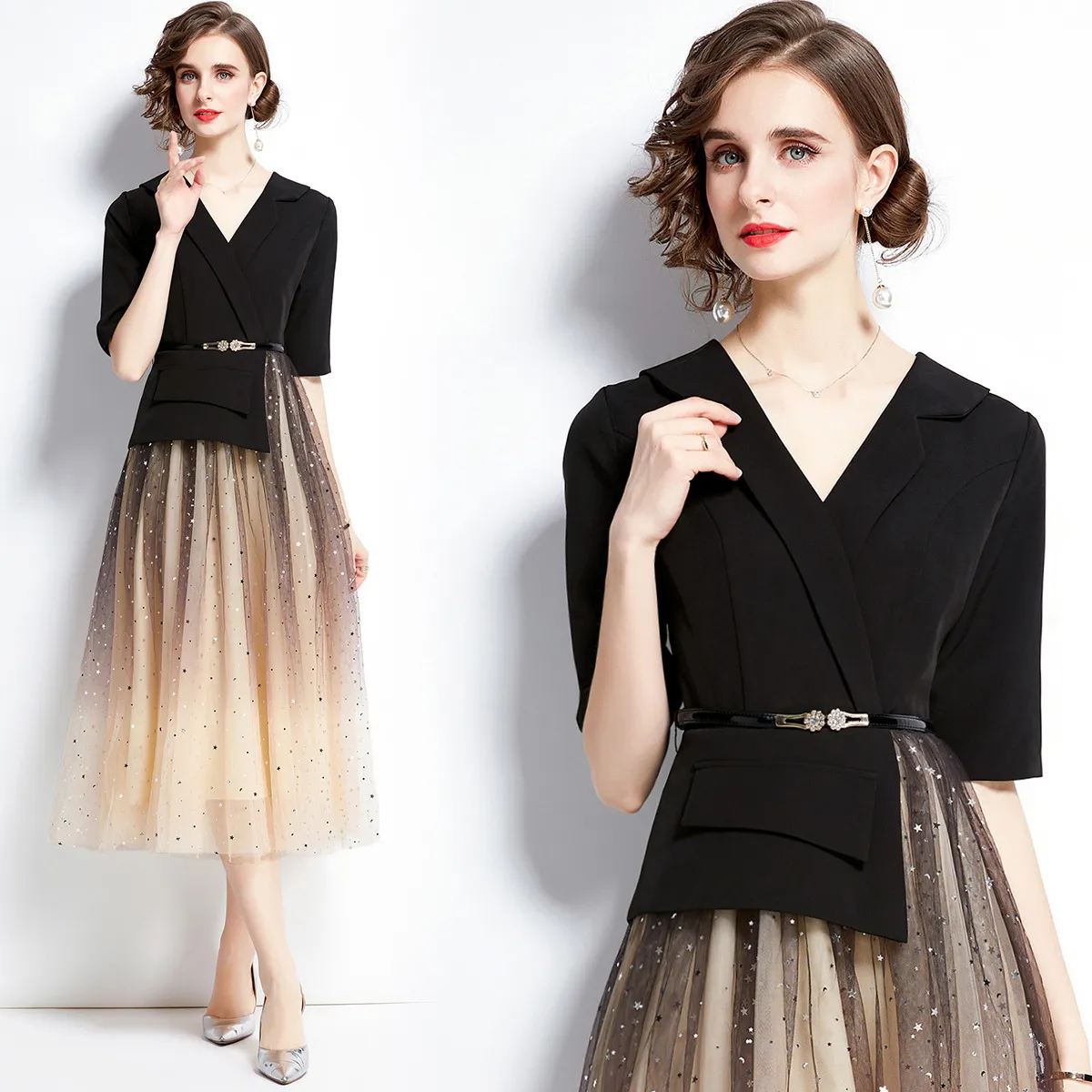 衣都精品- 2023新款假兩件漸變色網紗大擺連衣裙