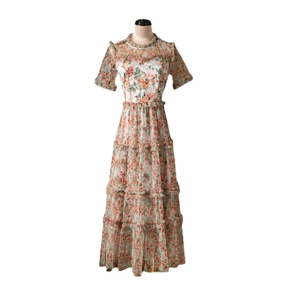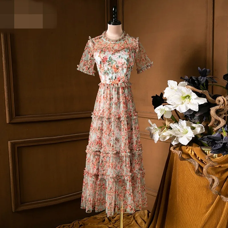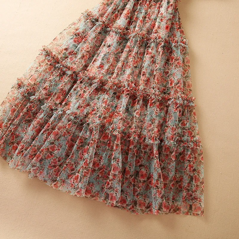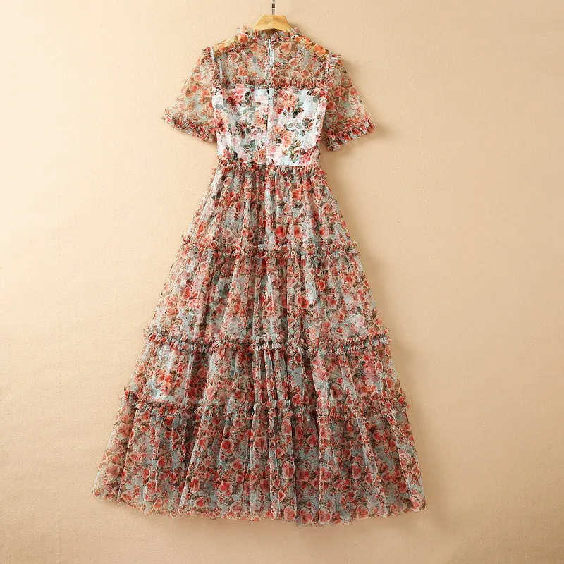 衣都精品- 2023新款歐美時尚印花網紗修身顯瘦連衣裙
