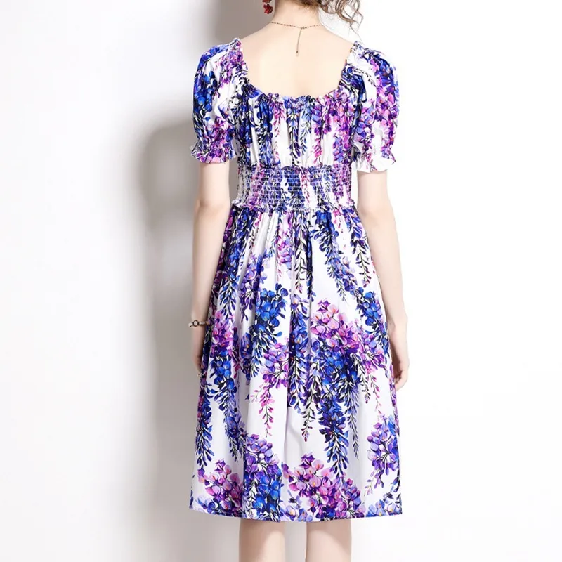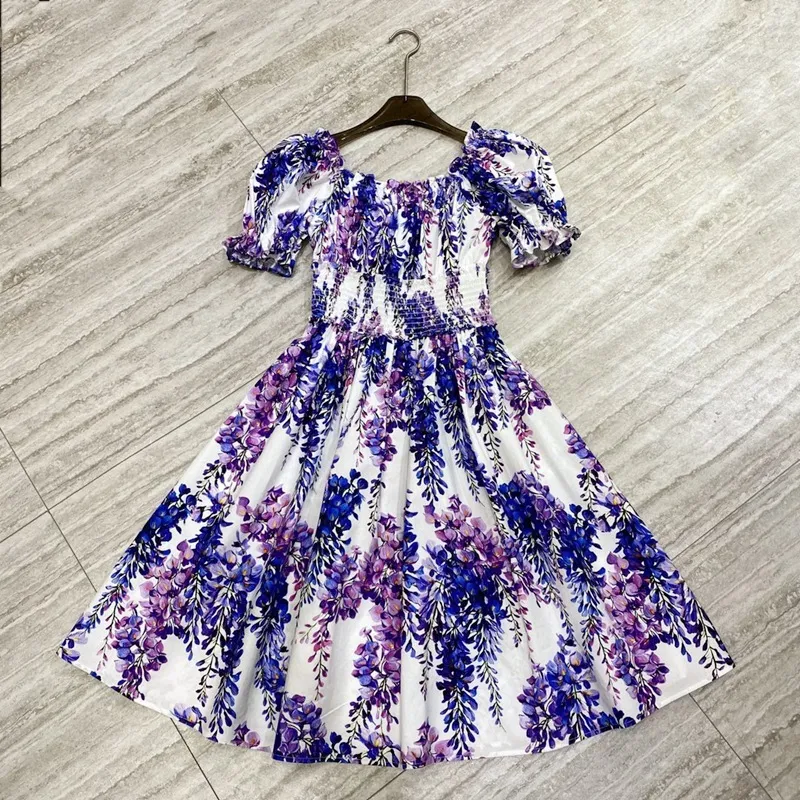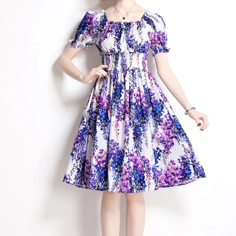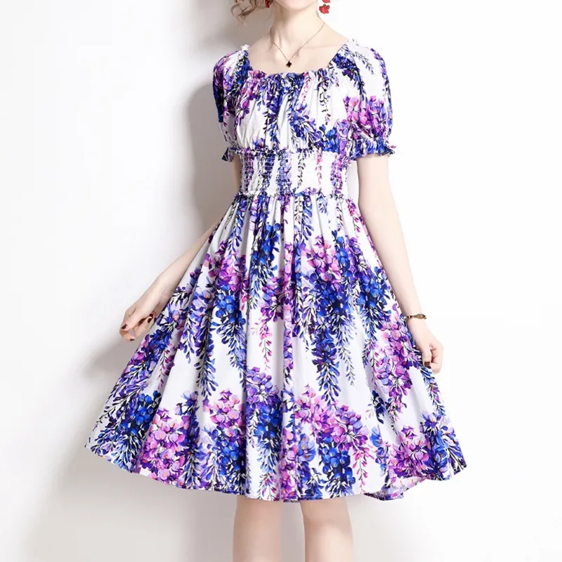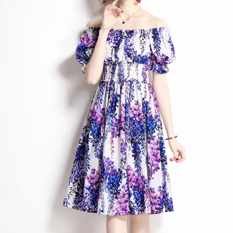 衣都精品- 2023新款一字領時尚紫藤花印花連衣裙