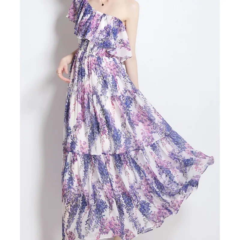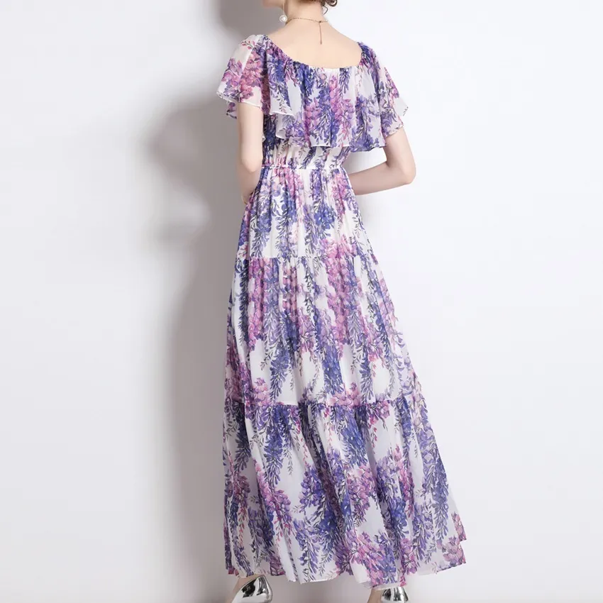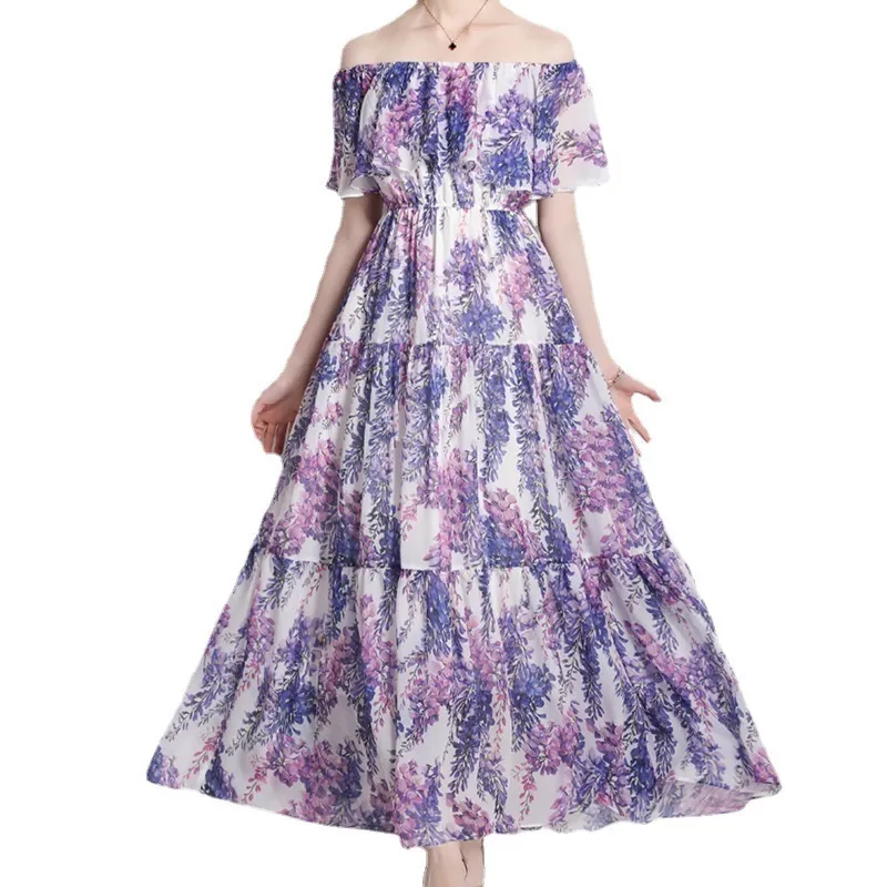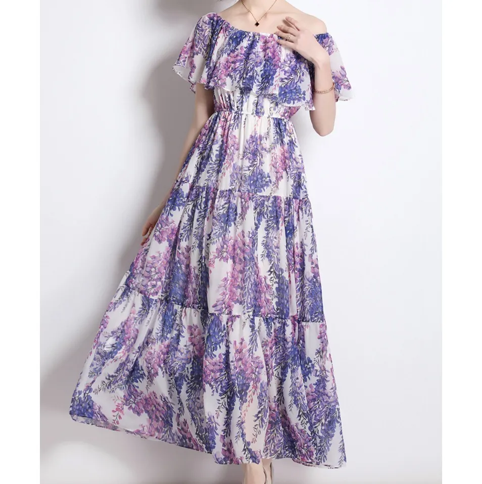 衣都精品- 2023新款一字領時尚紫藤花印花連衣裙