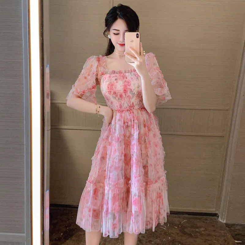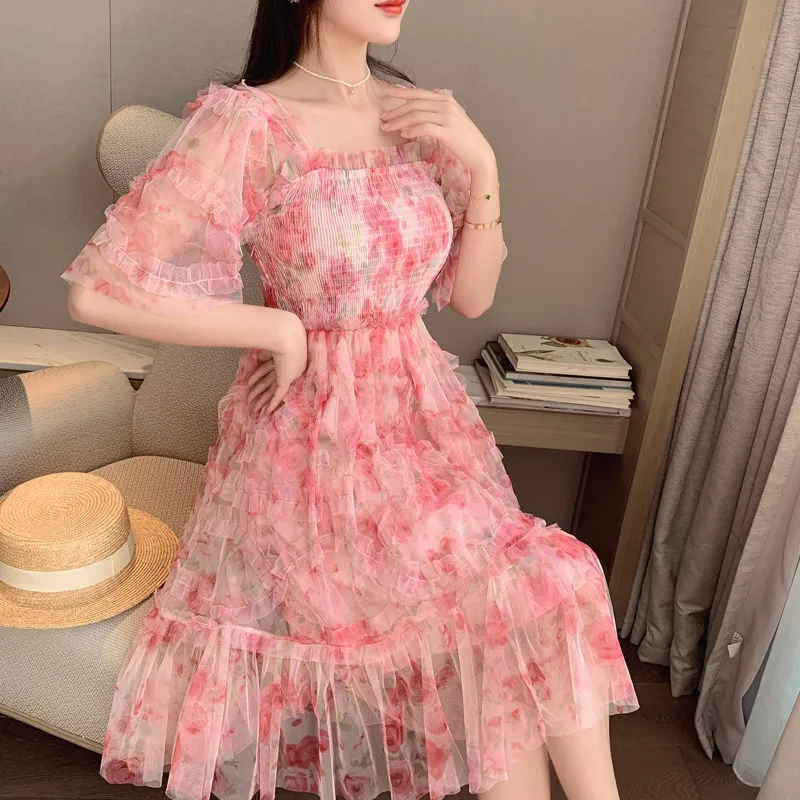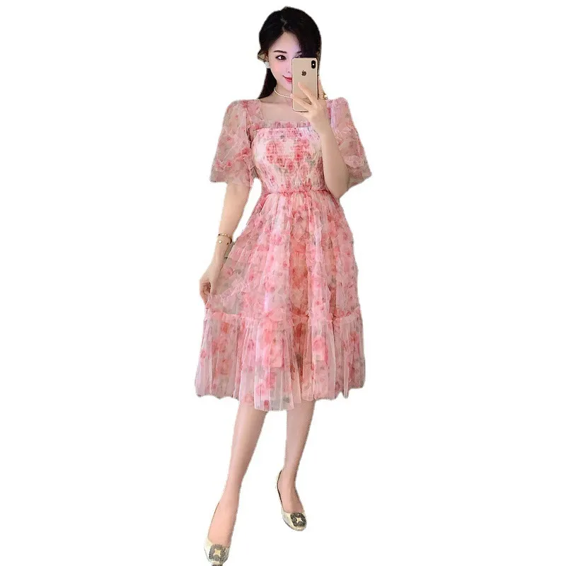衣都精品- 2023新款法式碎花一字肩網紗鏤空連衣裙