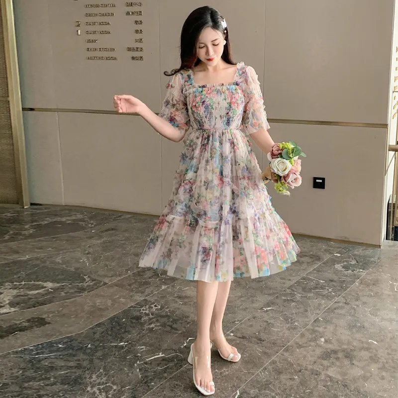 衣都精品- 2023新款歐美時尚印花網紗修身顯瘦連衣裙