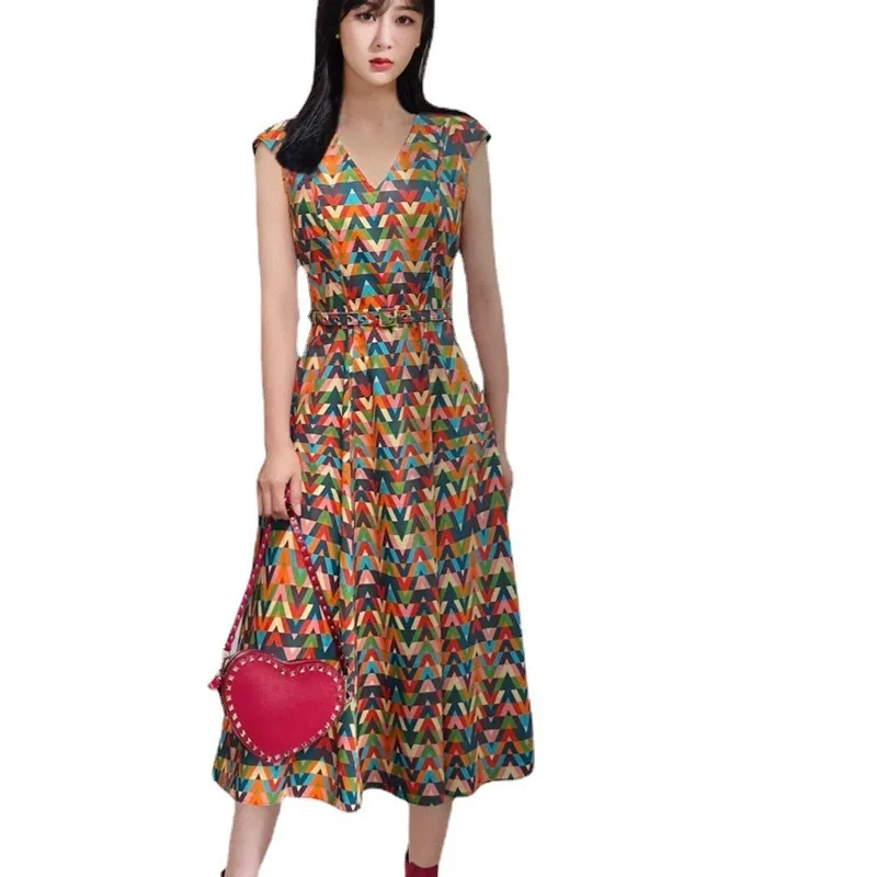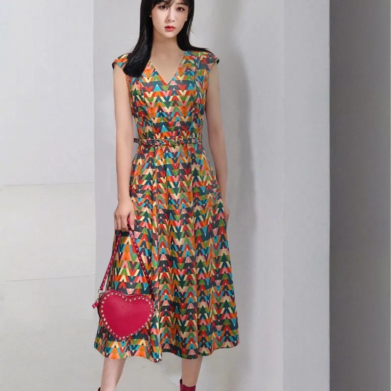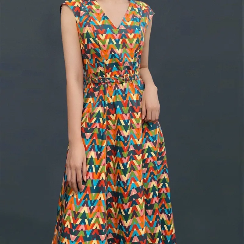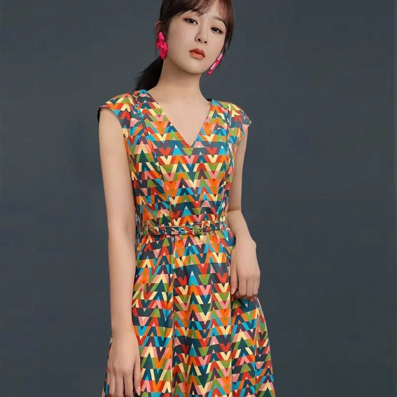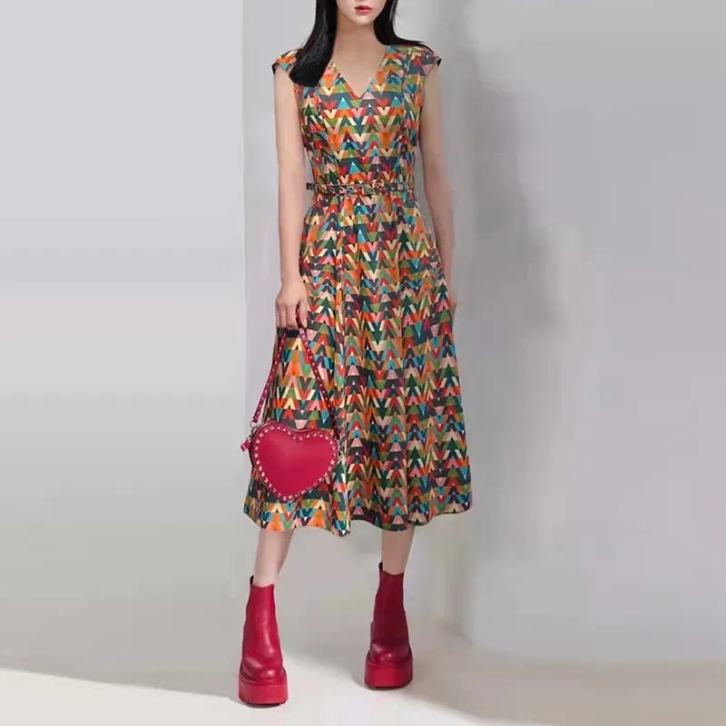 衣都精品- 2023新款明星同款彩色幾何圖案高腰連衣裙
