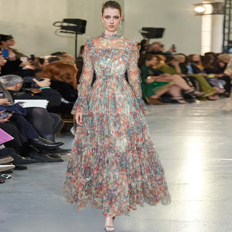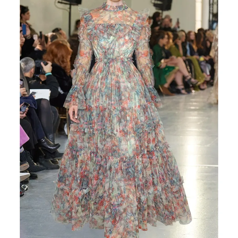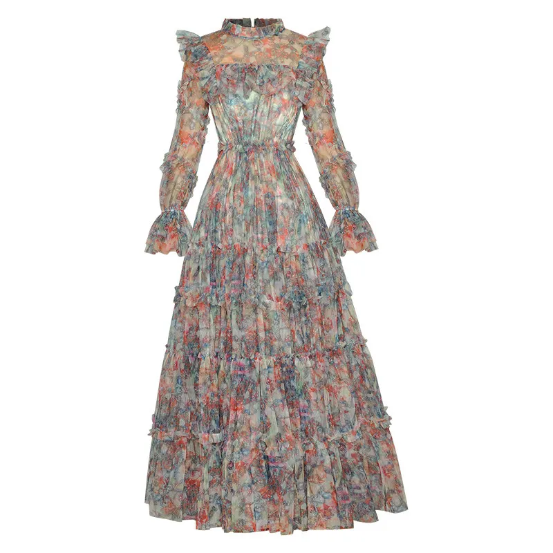 衣都精品- 2023新款立領網紗透視長袖荷葉邊連衣裙