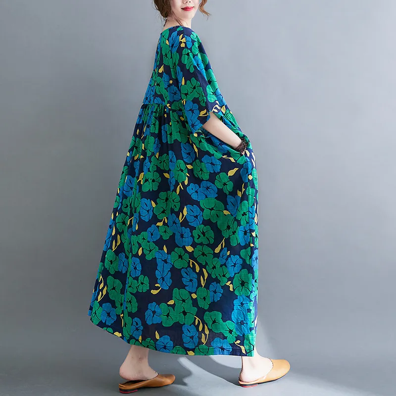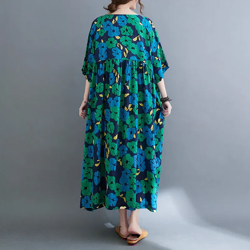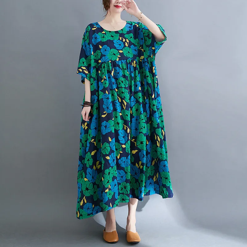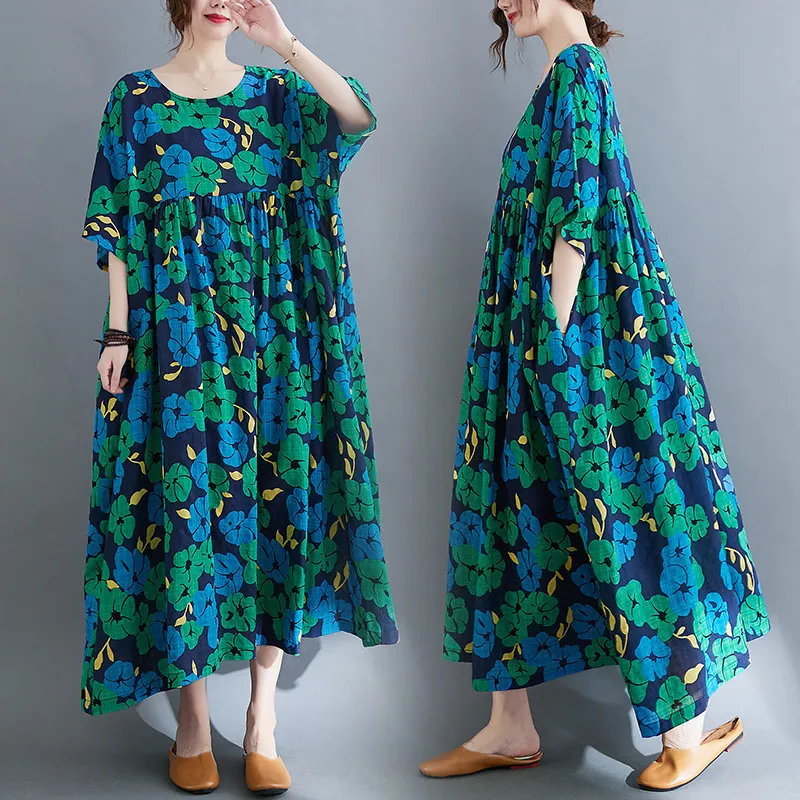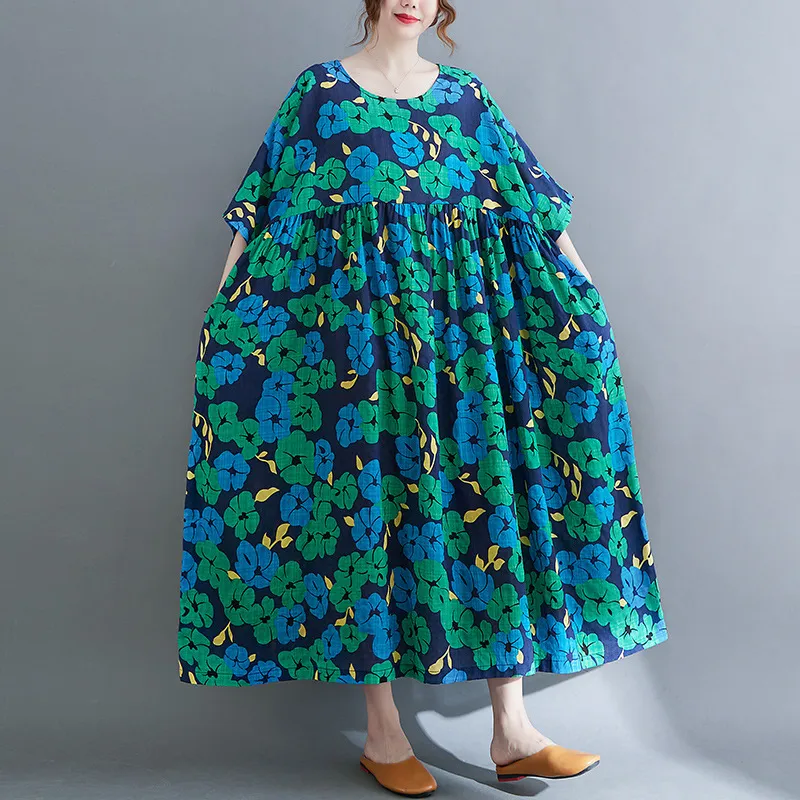 衣都精品- 2023新款寬鬆圓領短袖花朵連衣裙