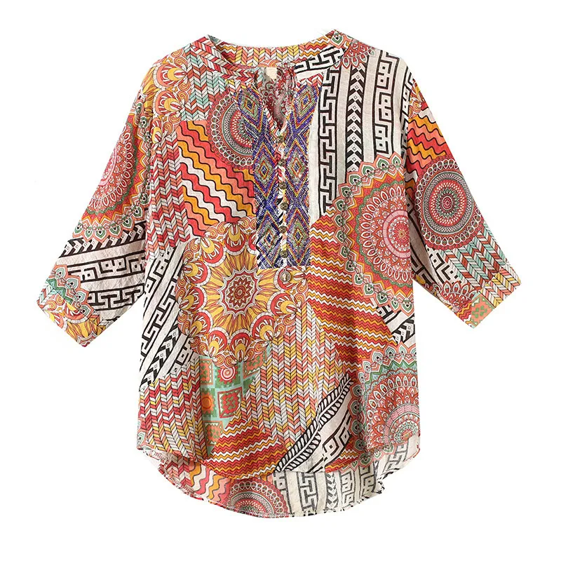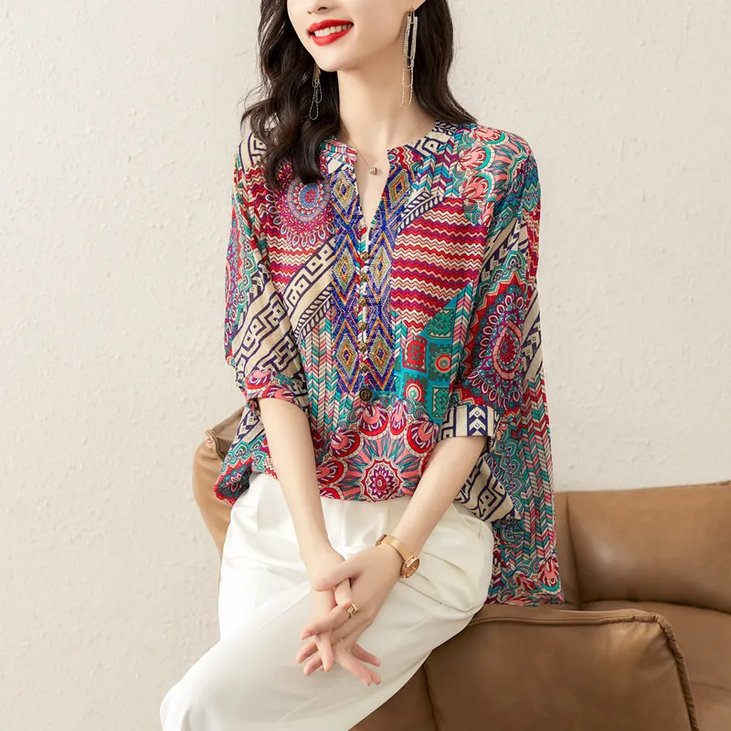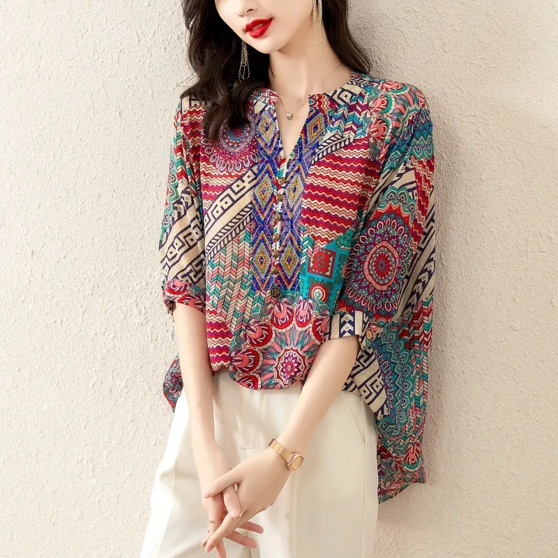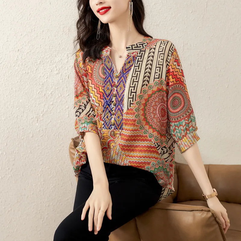 衣都精品- 2023新款減齡印花大碼燙鑽V領短袖上衣