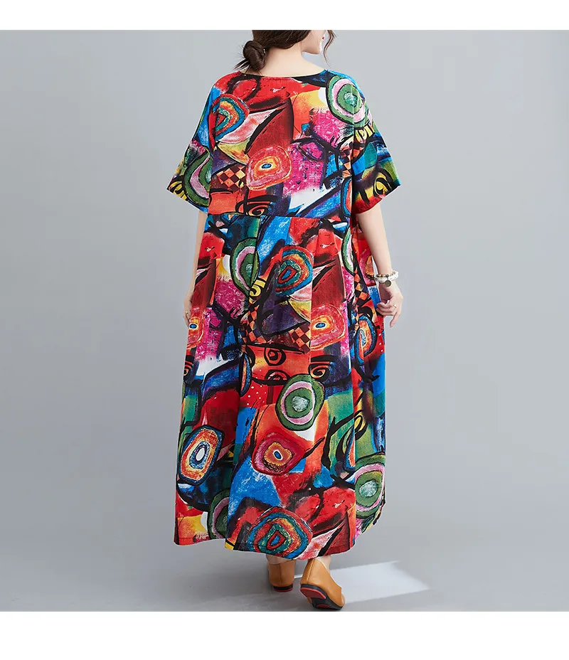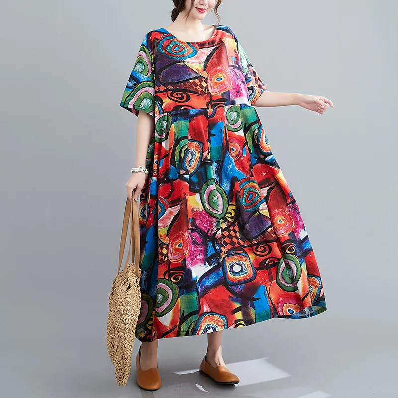 衣都精品- 2023新款寬鬆圓領短袖花朵連衣裙