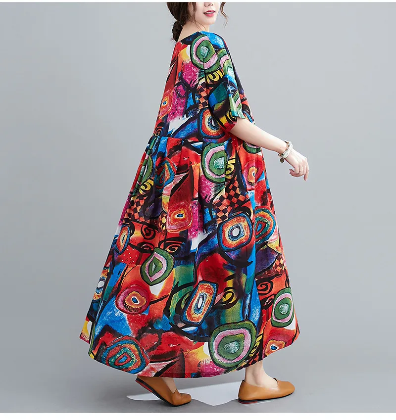 衣都精品- 2023新款田園風文藝復古印花打褶連衣裙