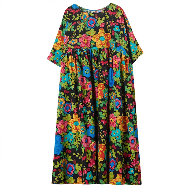 衣都精品- 2023新款寬鬆圓領短袖花朵連衣裙