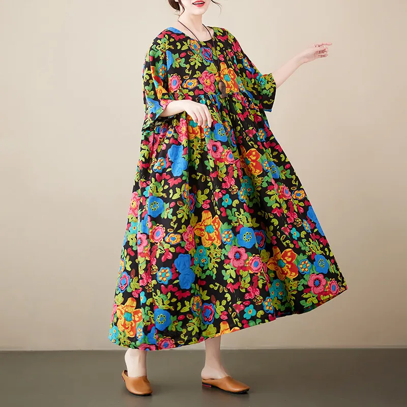 衣都精品- 2023新款田園風文藝復古印花打褶連衣裙