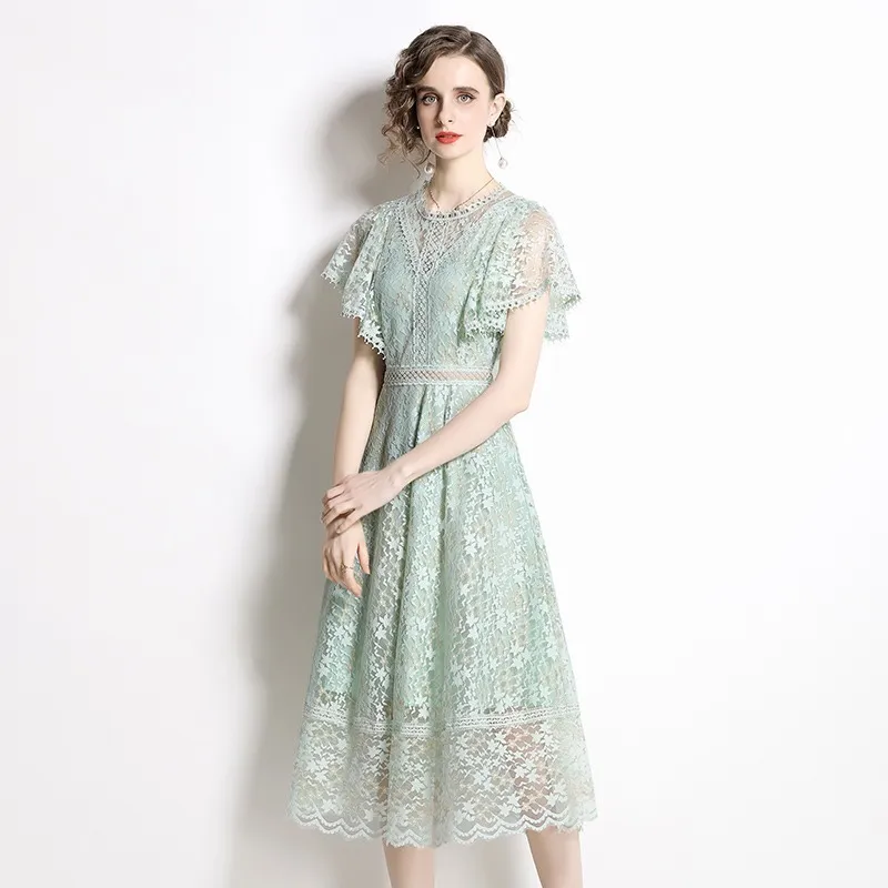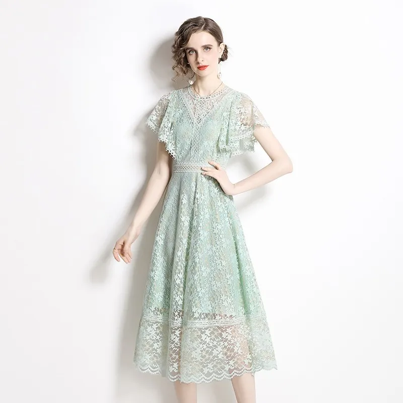 衣都精品- 2023新款氣質蕾絲A字裙短袖收腰連衣裙