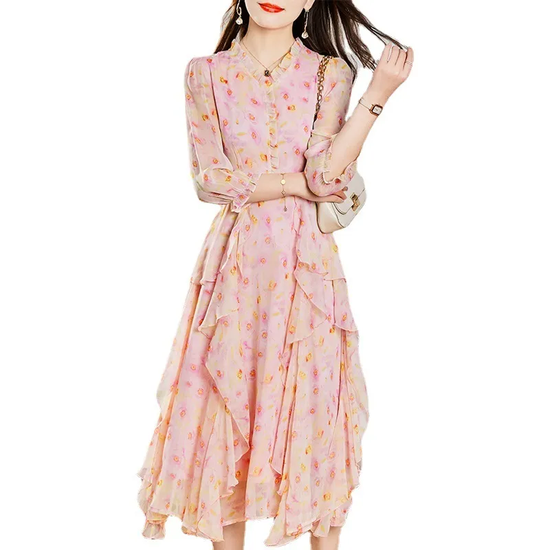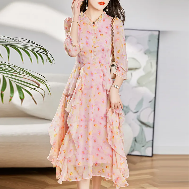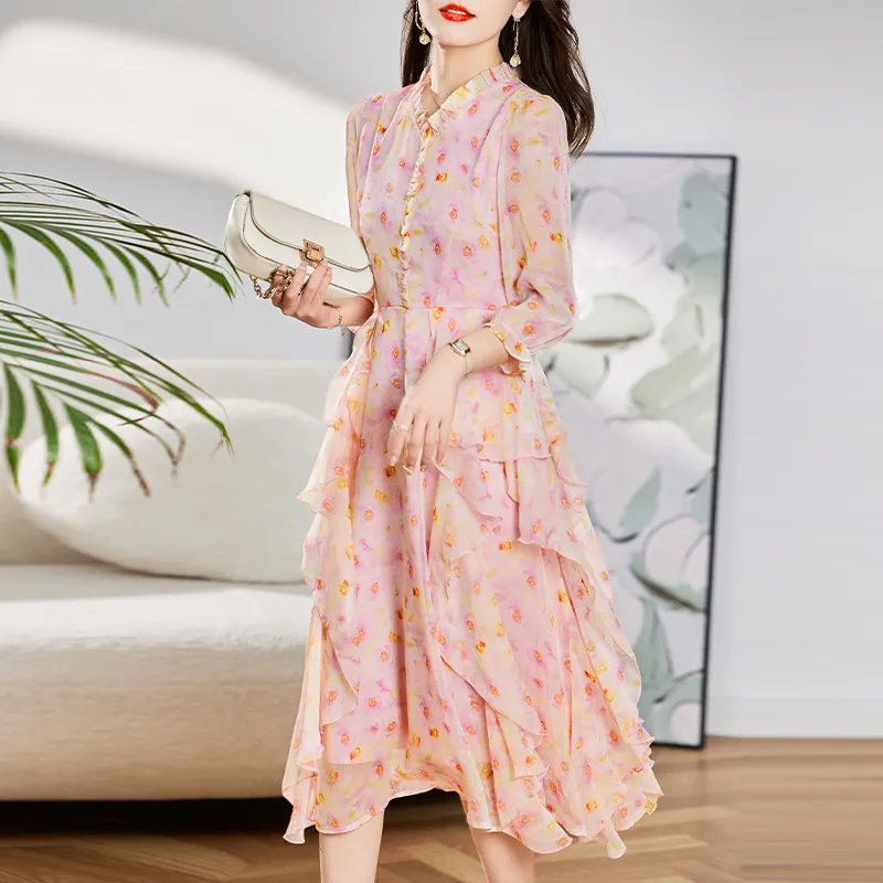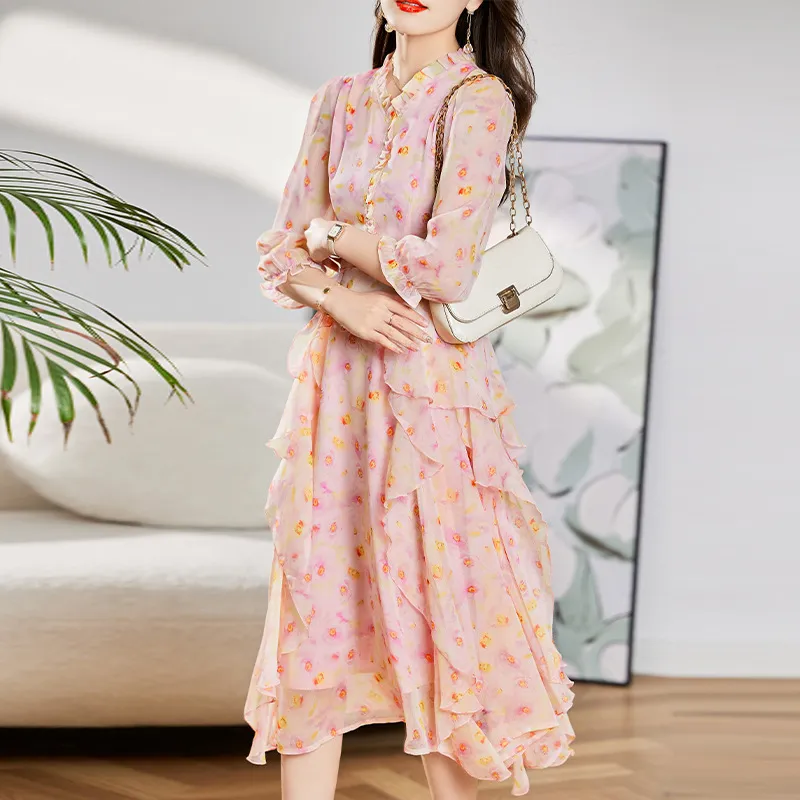衣都精品- 2023新款甜美荷葉領碎花雪紡連衣裙