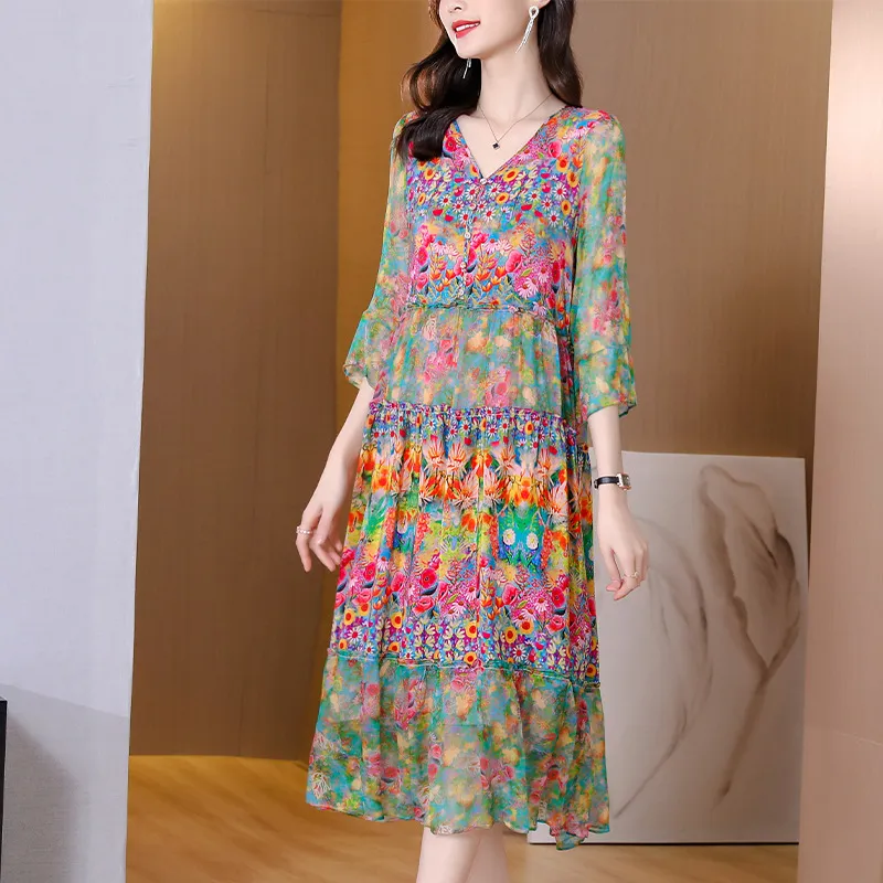 衣都精品- 2023新款時尚V領印花收腰顯瘦連衣裙