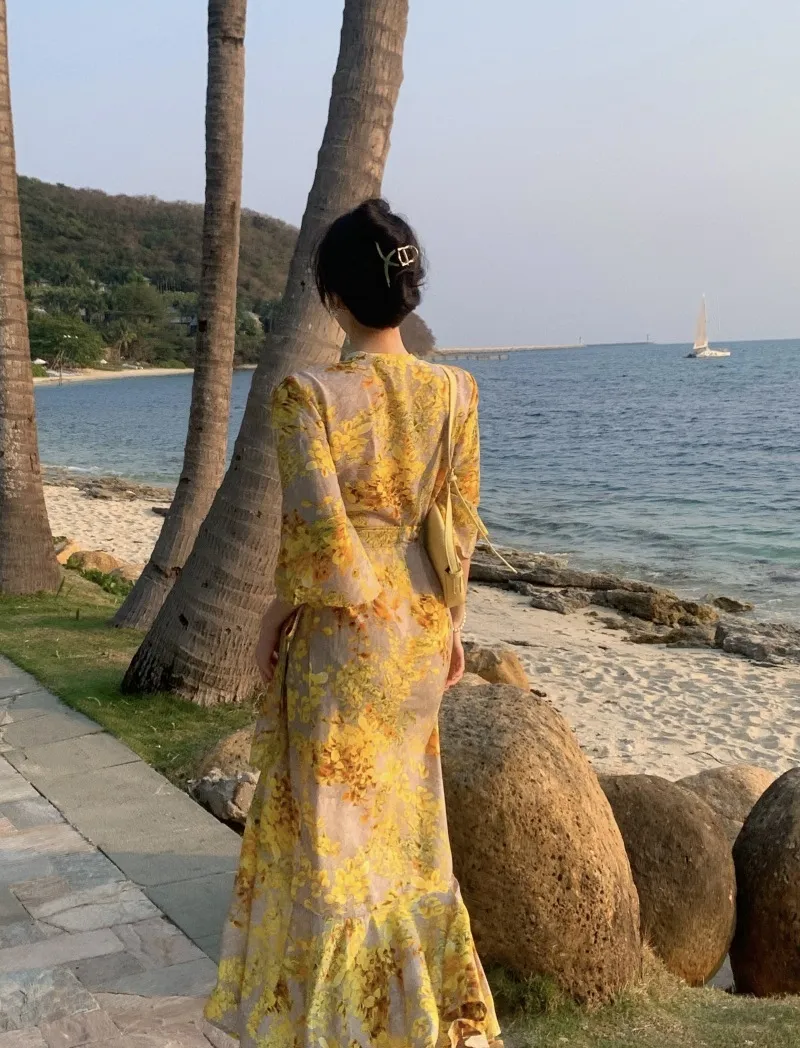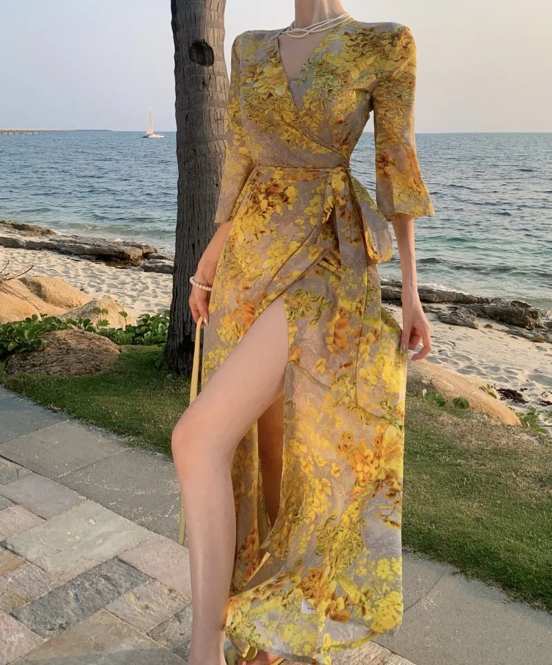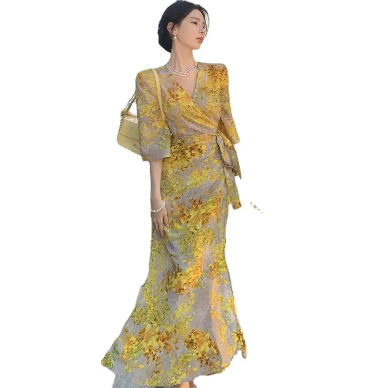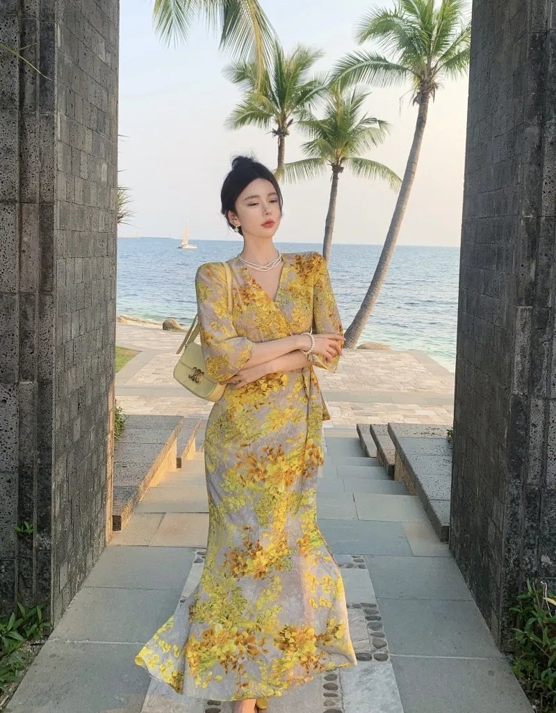衣都精品- 2023新款法式風情金黃色花卉裹身連衣裙