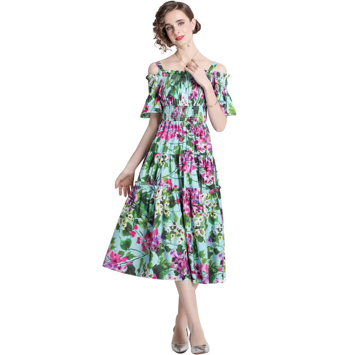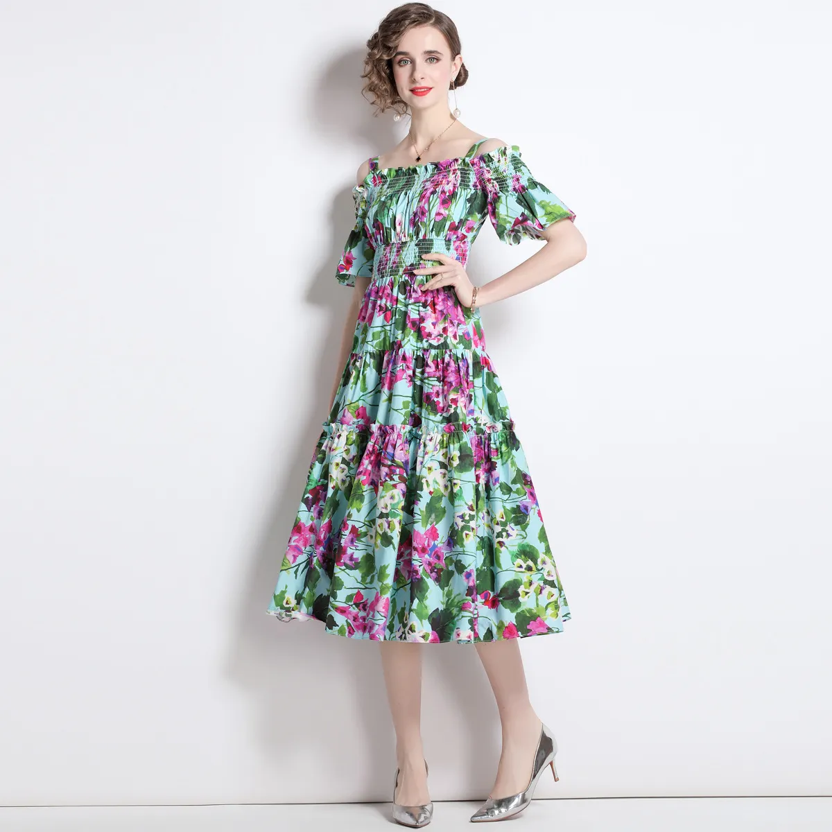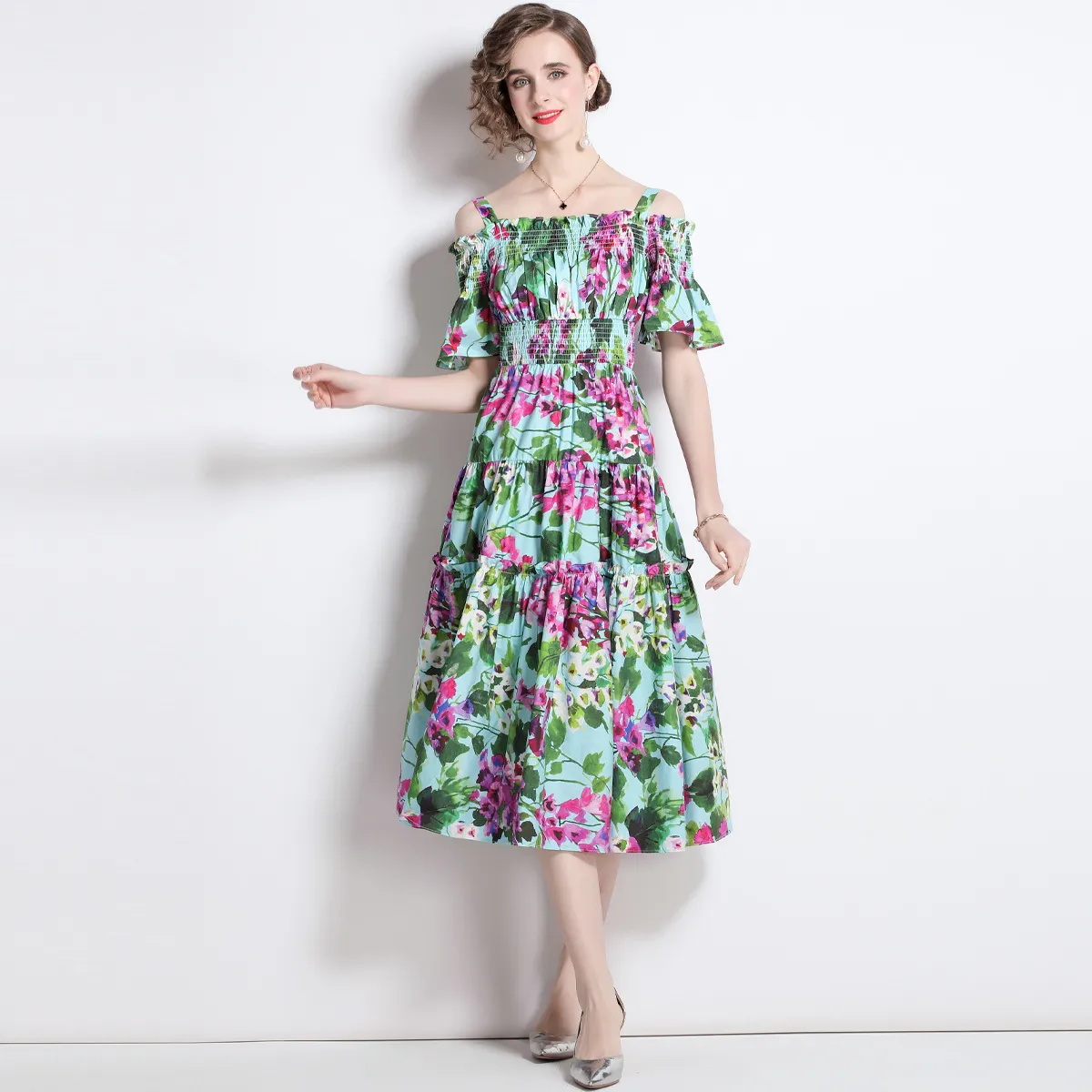 衣都精品- 2023新款吊帶一字肩短袖印花鬆緊腰連衣裙