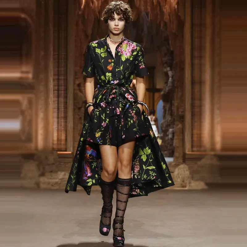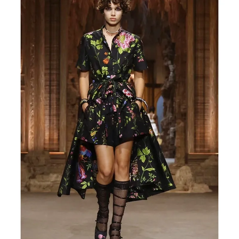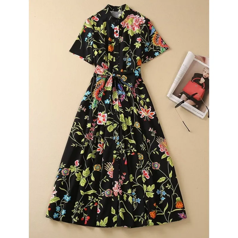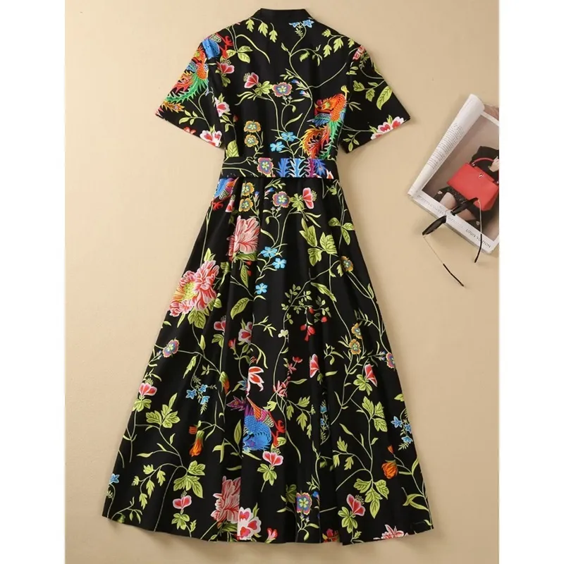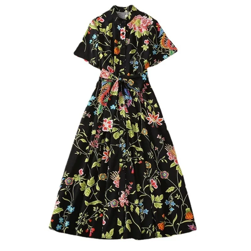 衣都精品- 2023新款印花短袖開衫單排扣大擺連衣裙