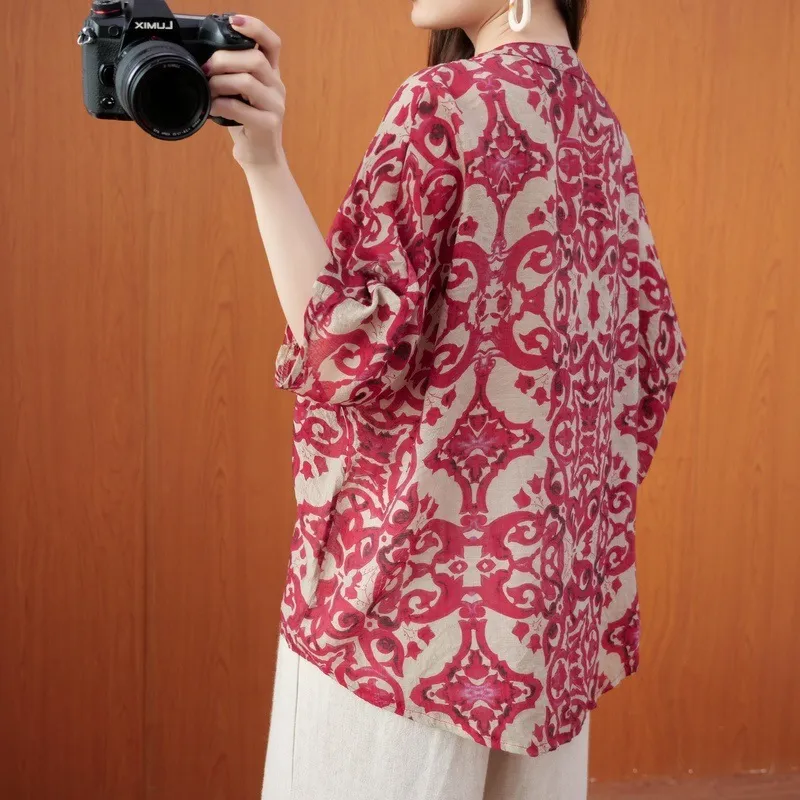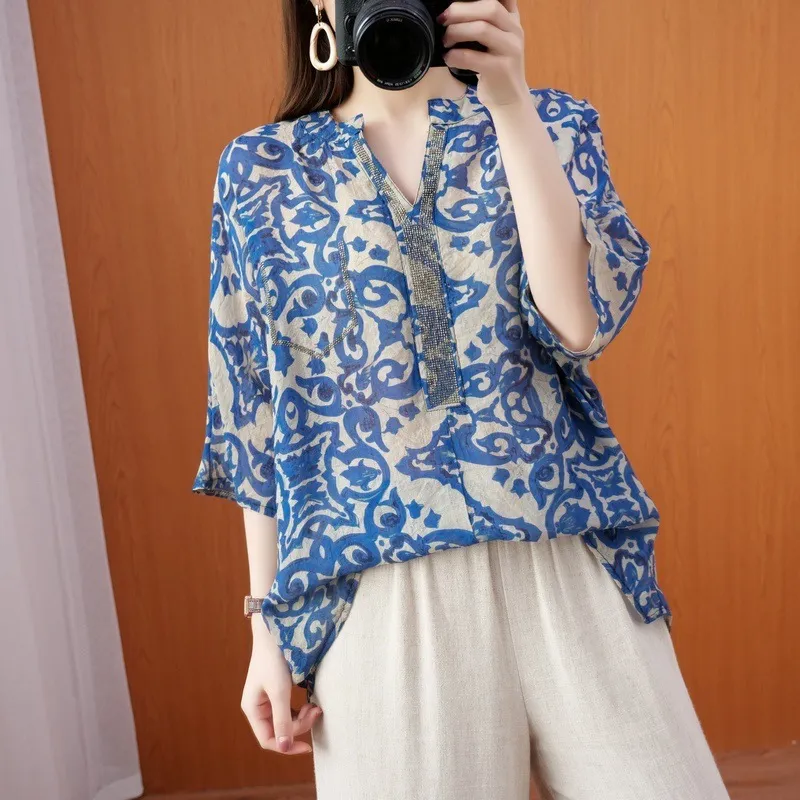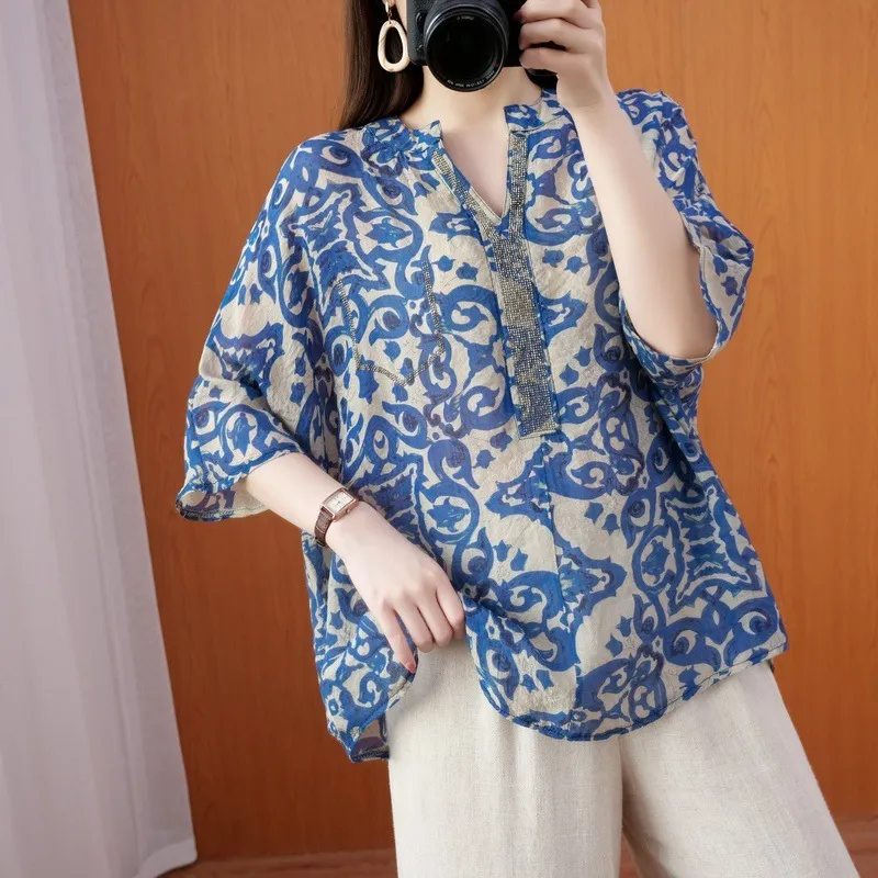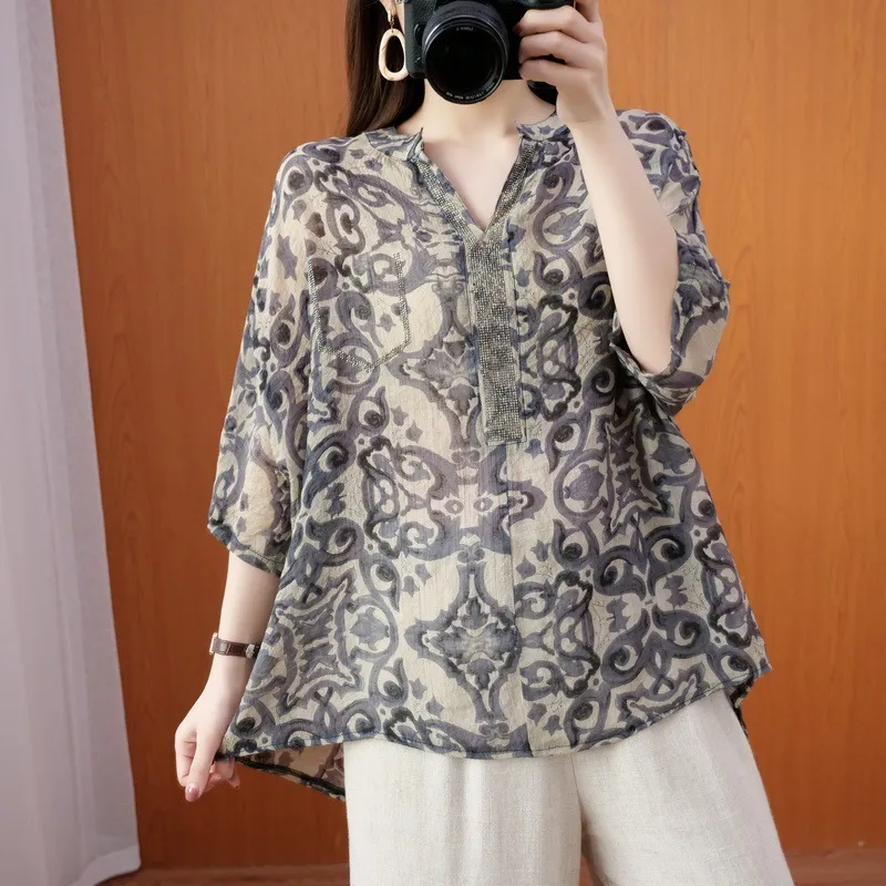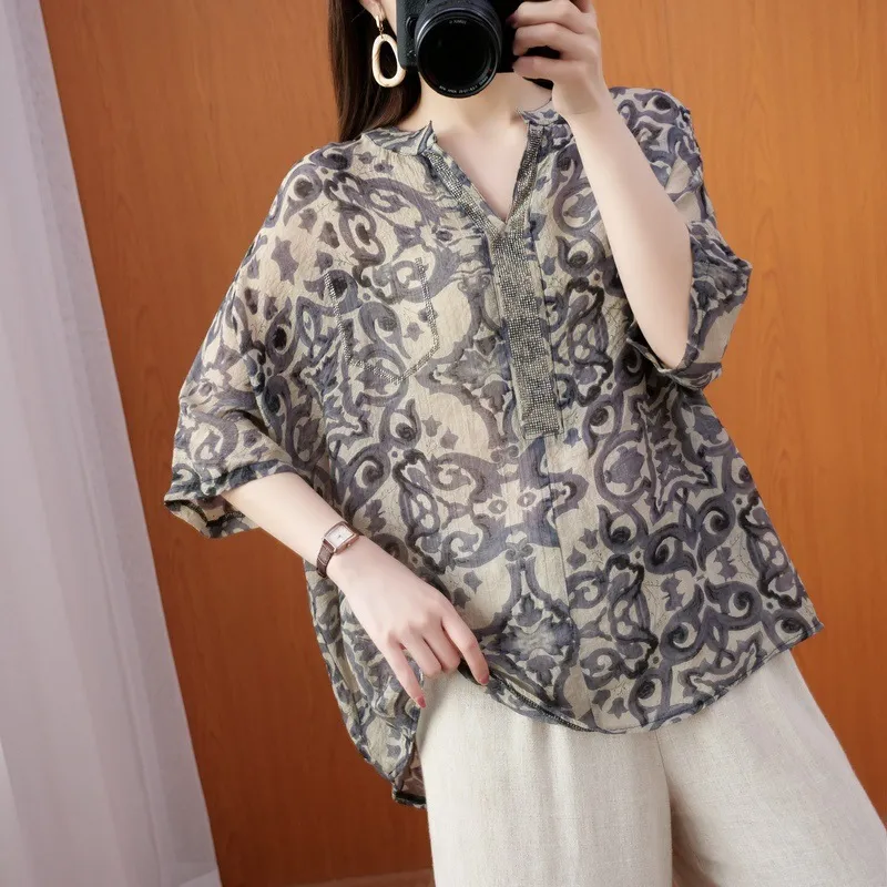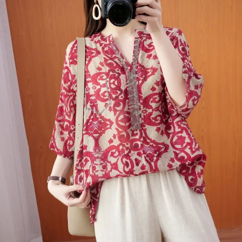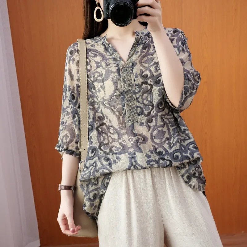 衣都精品- 2023新款寬鬆顯瘦遮肚時尚碎花燙鑽上衣