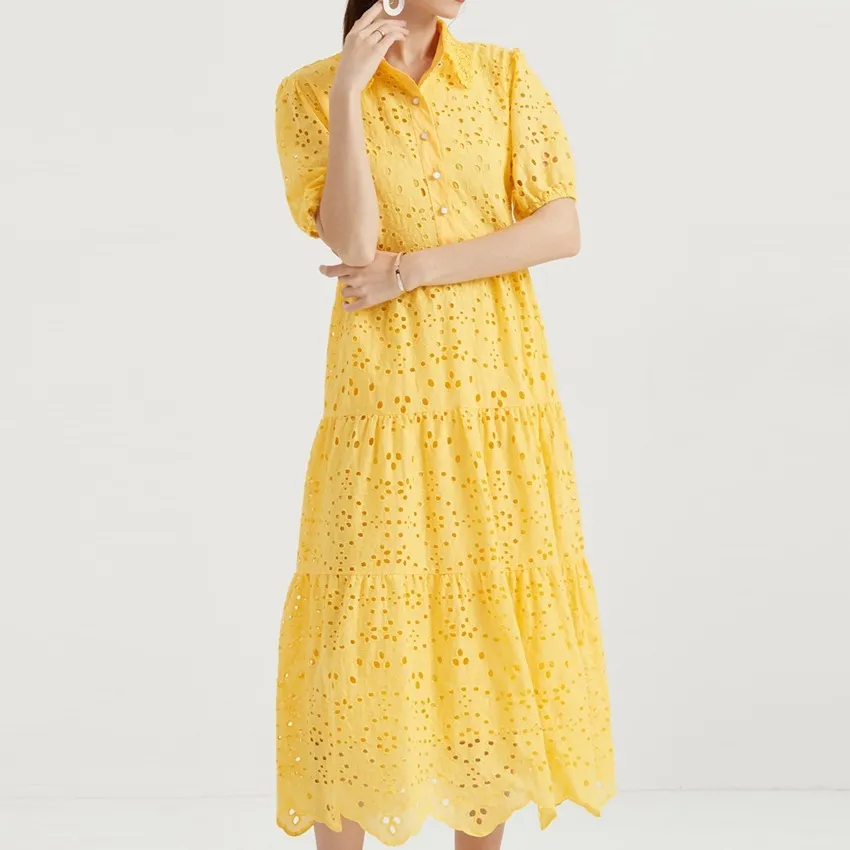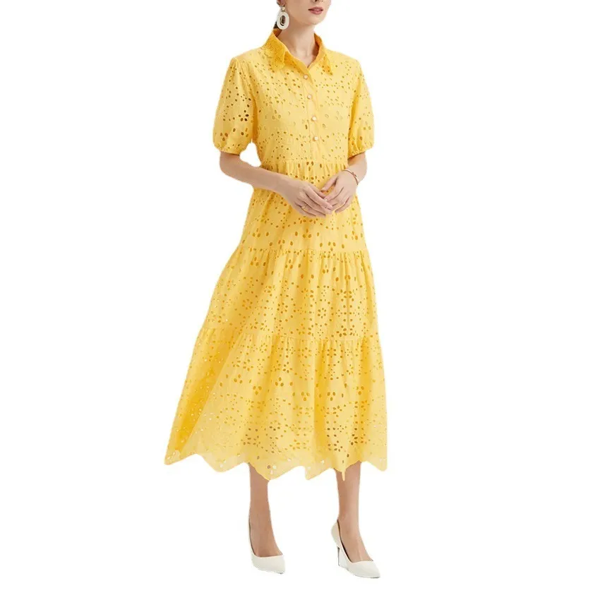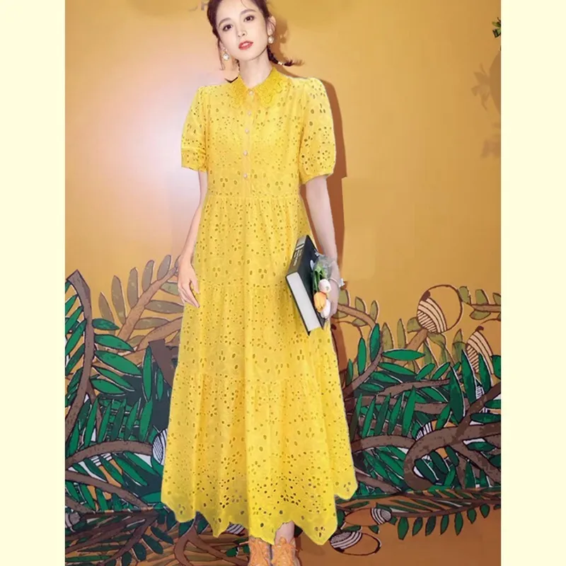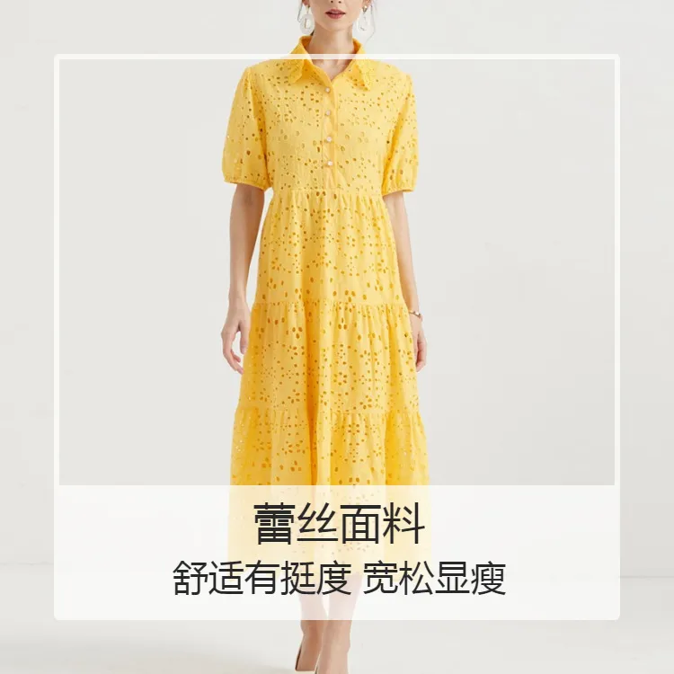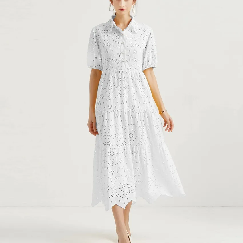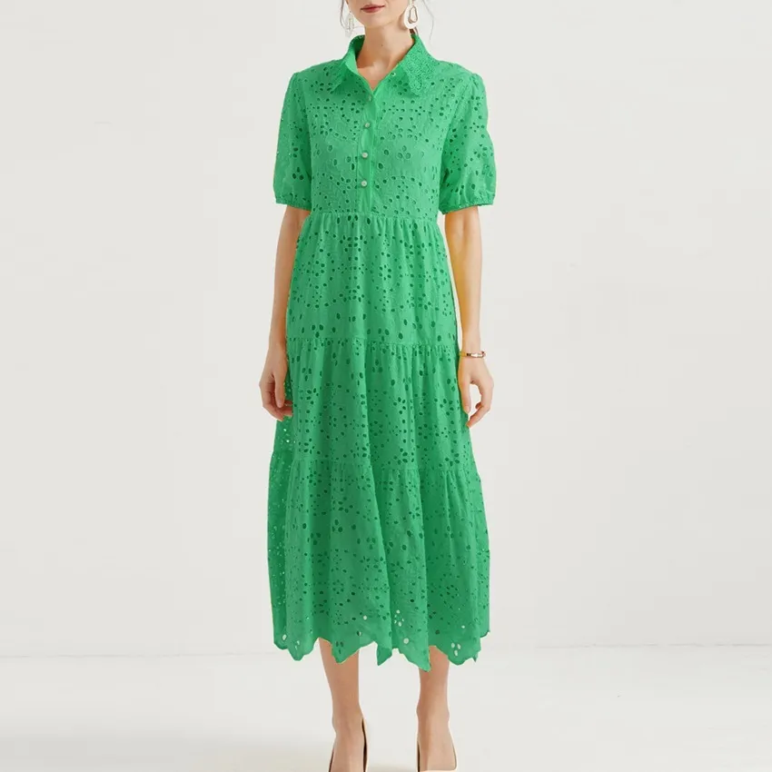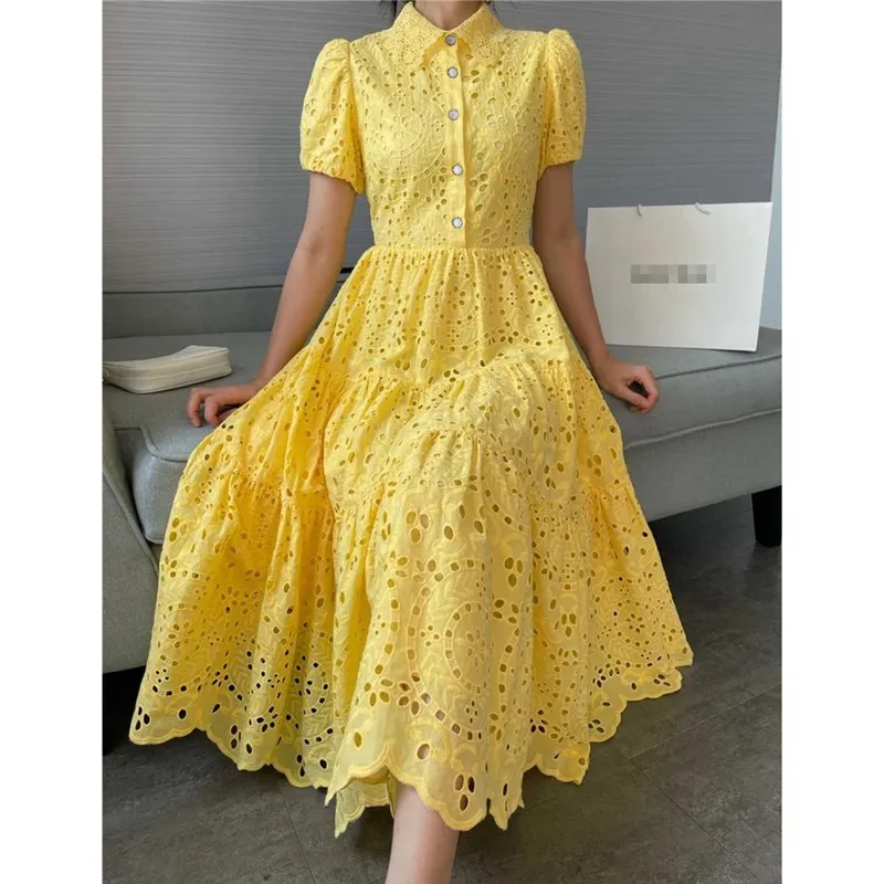衣都精品- 2023新款歐美鏤空刺繡蕾絲翻領泡泡袖連衣裙
