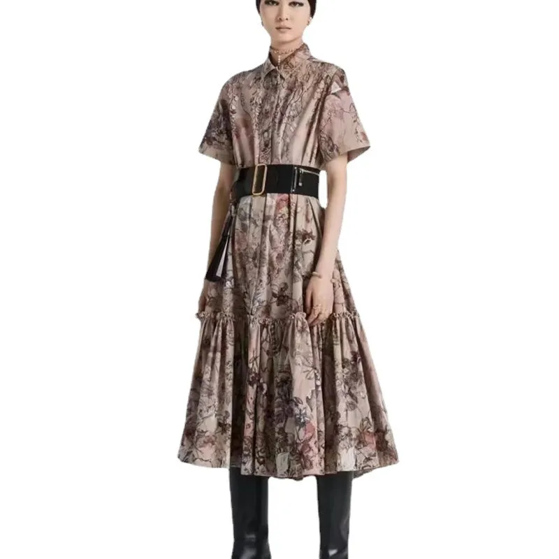 衣都精品- 2023新款翻領印花短袖單排扣繫帶連衣裙