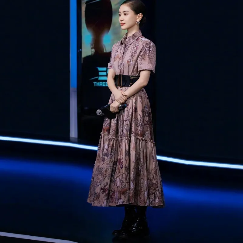 衣都精品- 2023新款優雅印花短袖單排扣繫帶禮服連衣裙