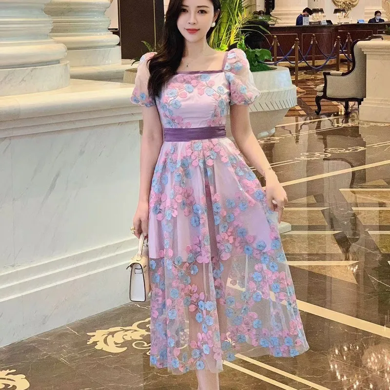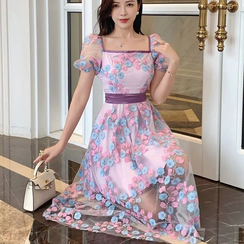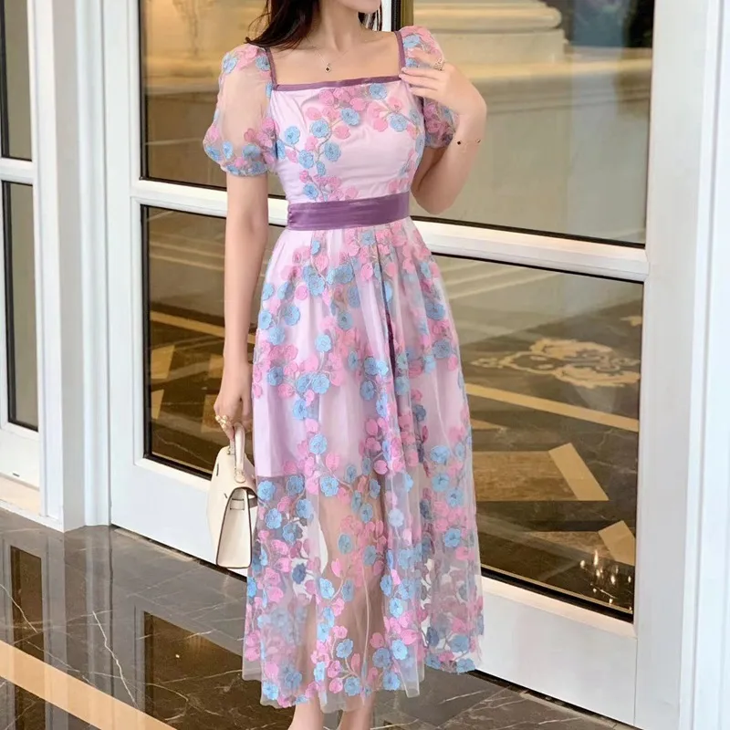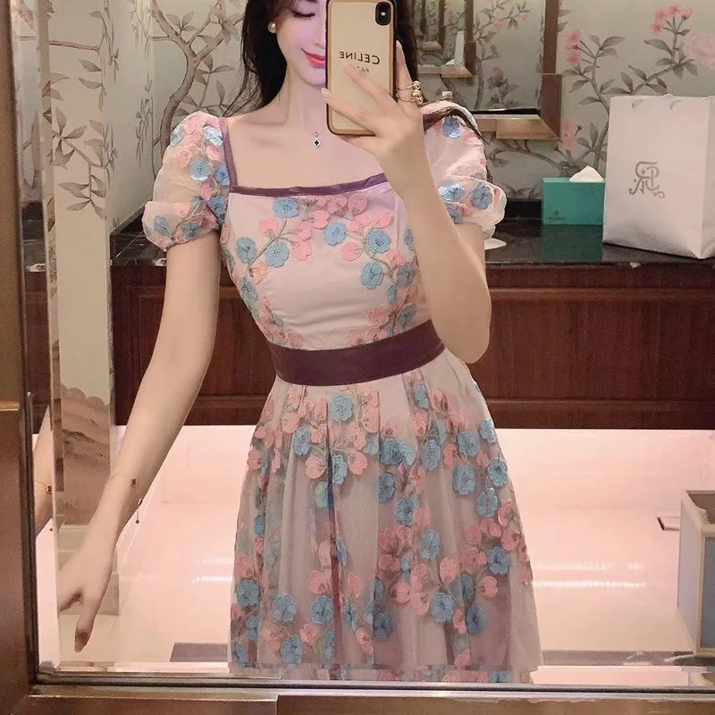 衣都精品- 2023新款復古網紗刺繡方領氣質修身露背連衣裙