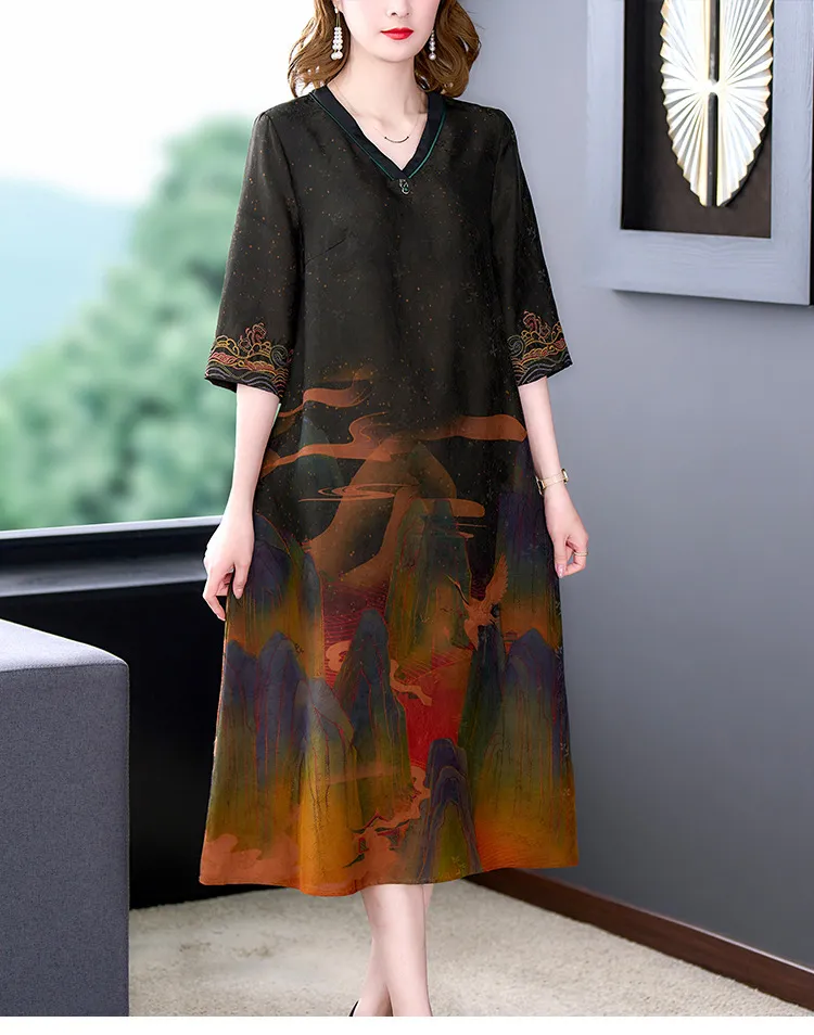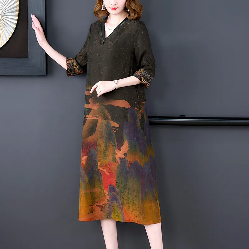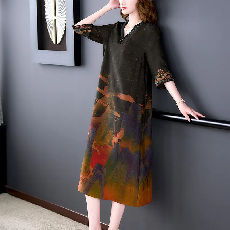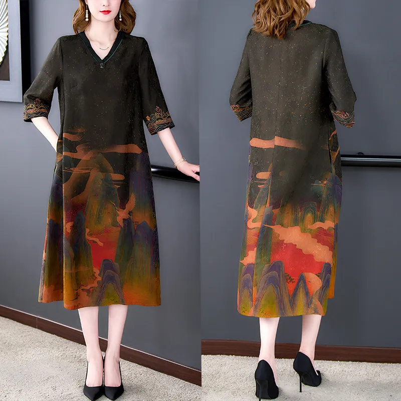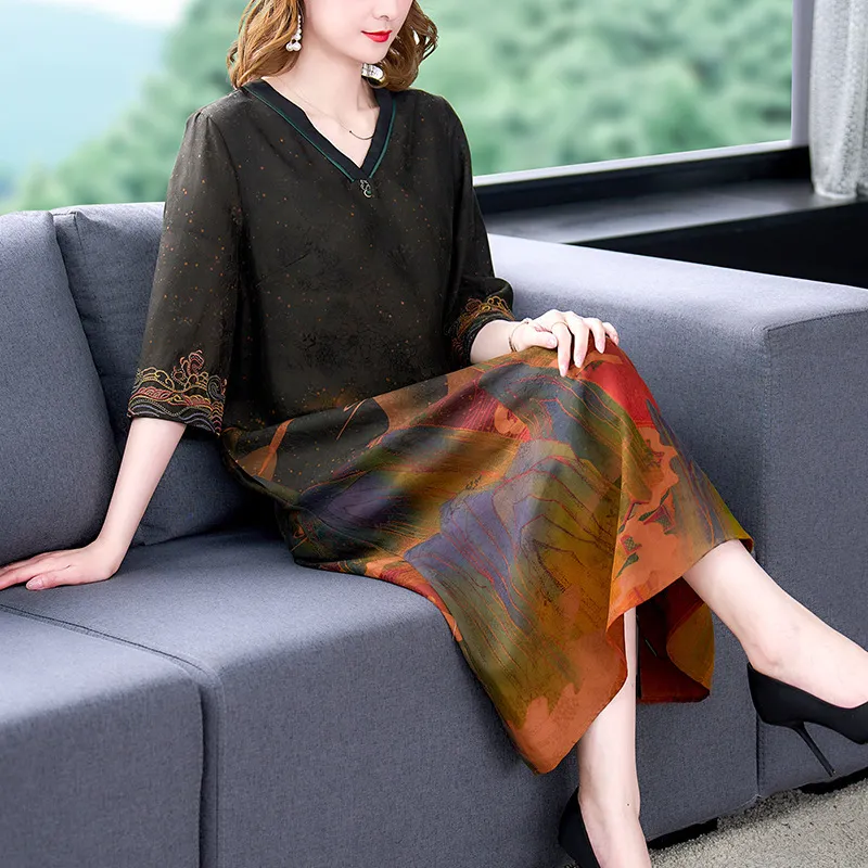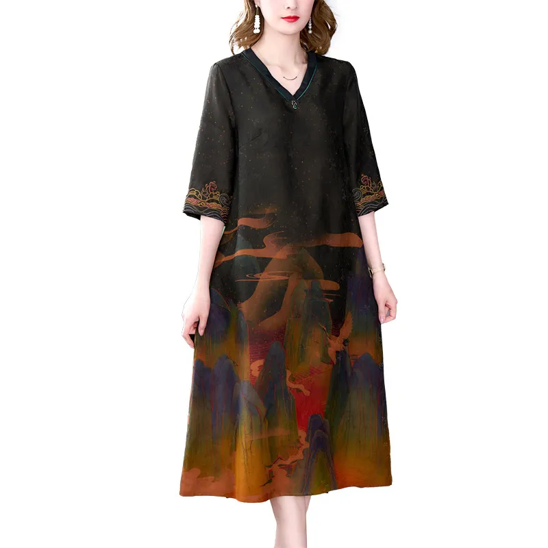 衣都精品- 2023新款時尚氣質寬鬆顯瘦刺繡香雲紗真絲連衣裙