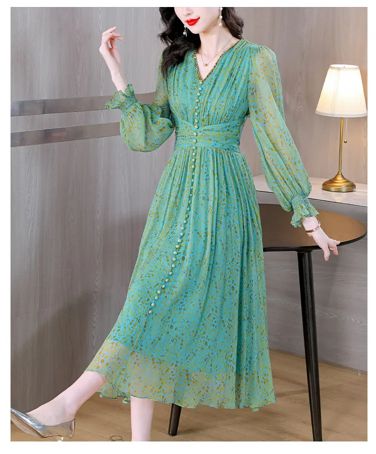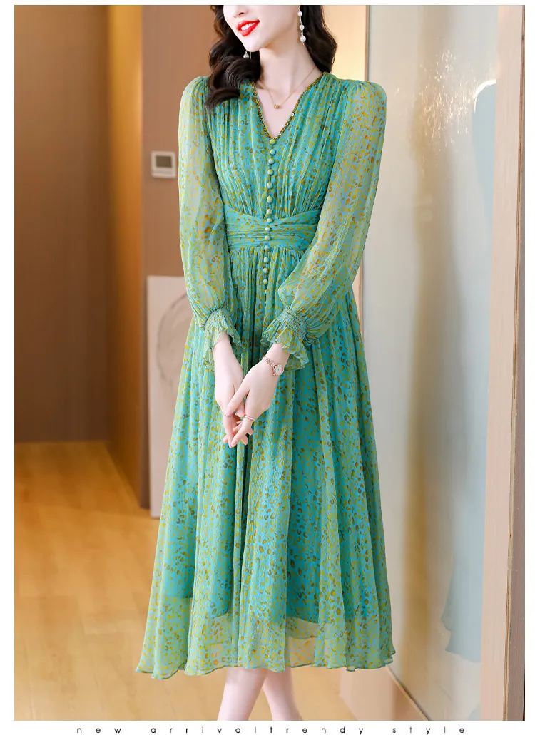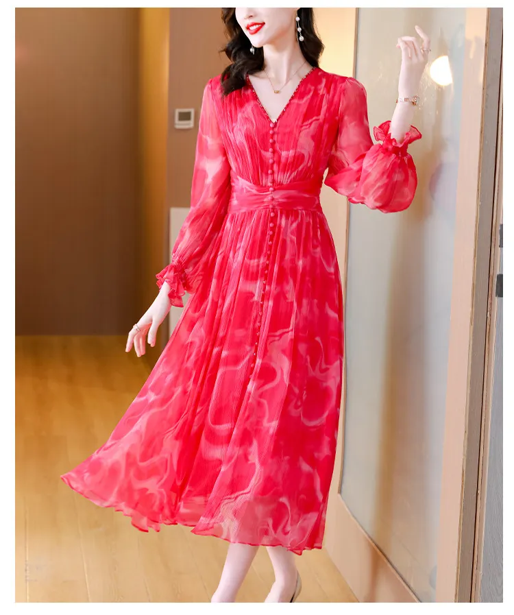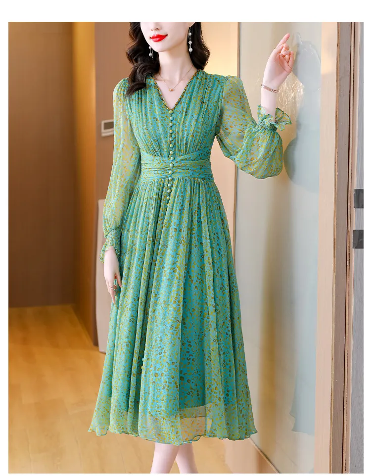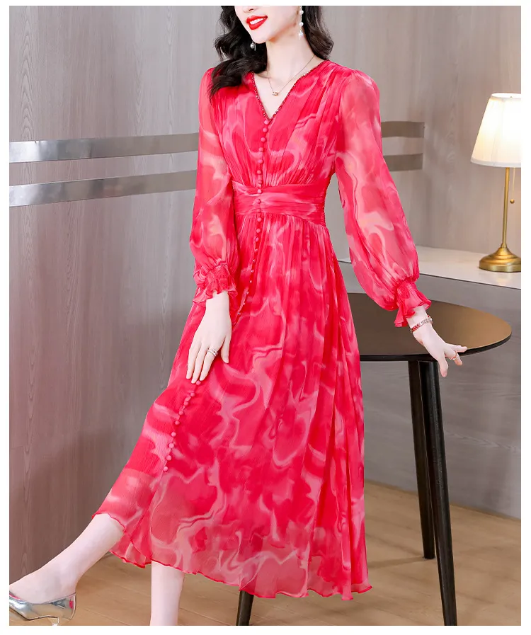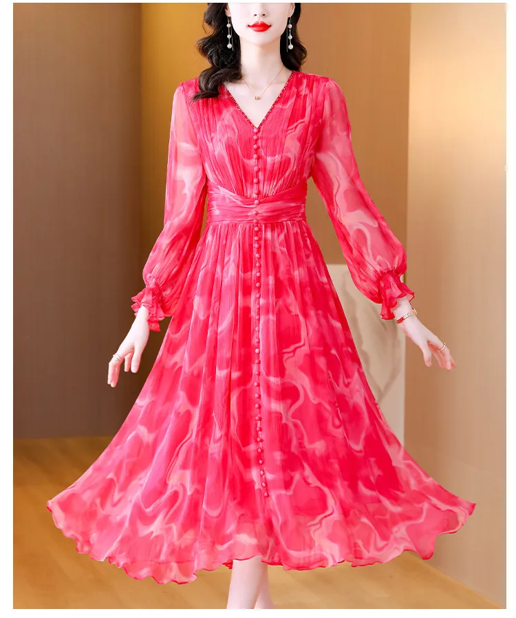 衣都精品- 2023新款法式甜美減齡收腰V領暈染連衣裙