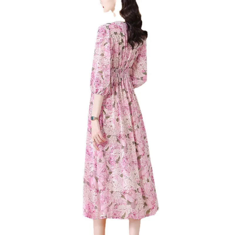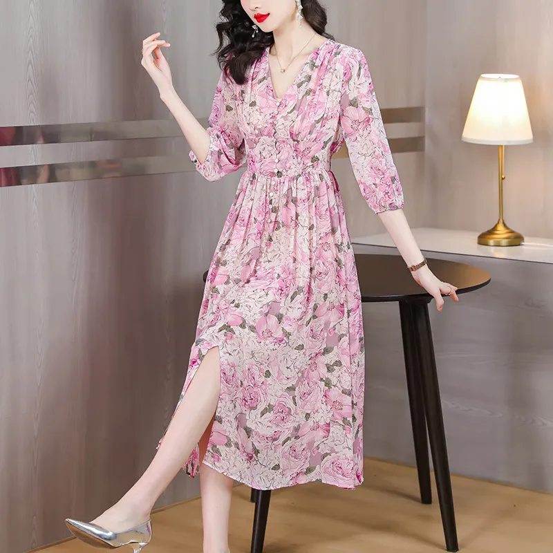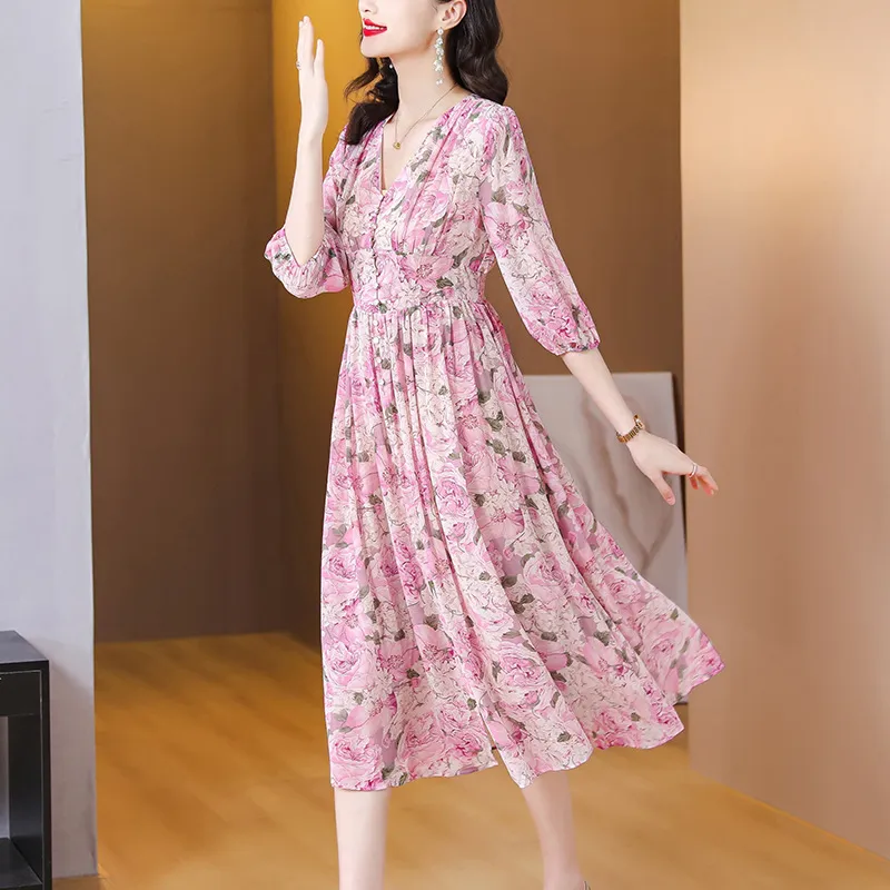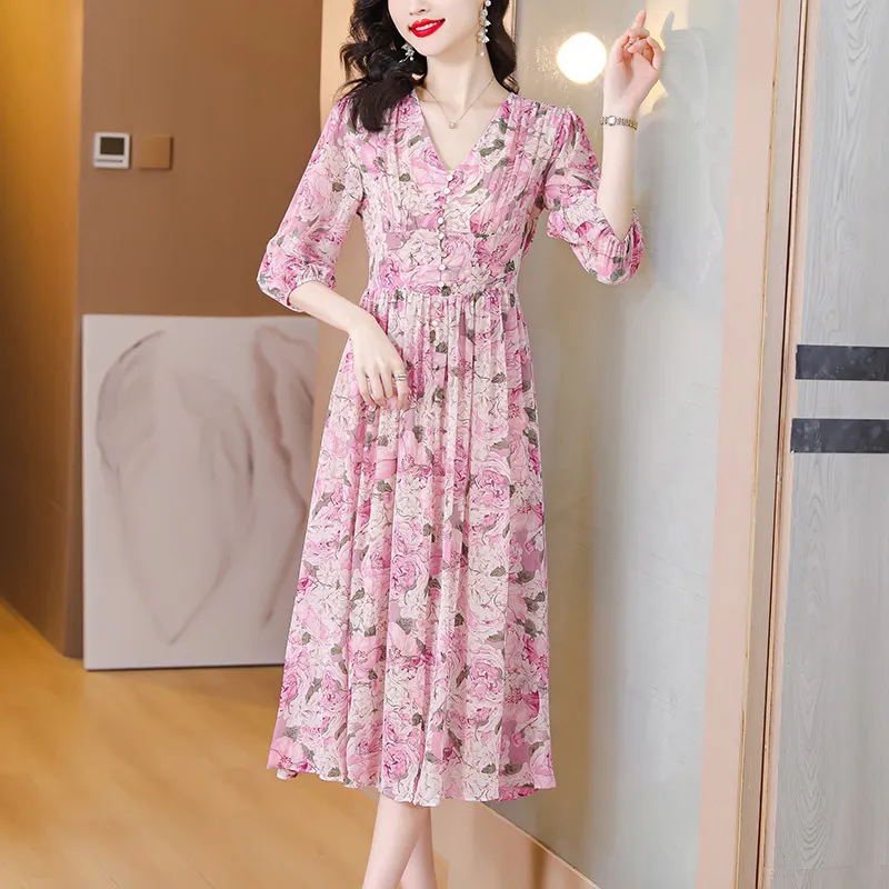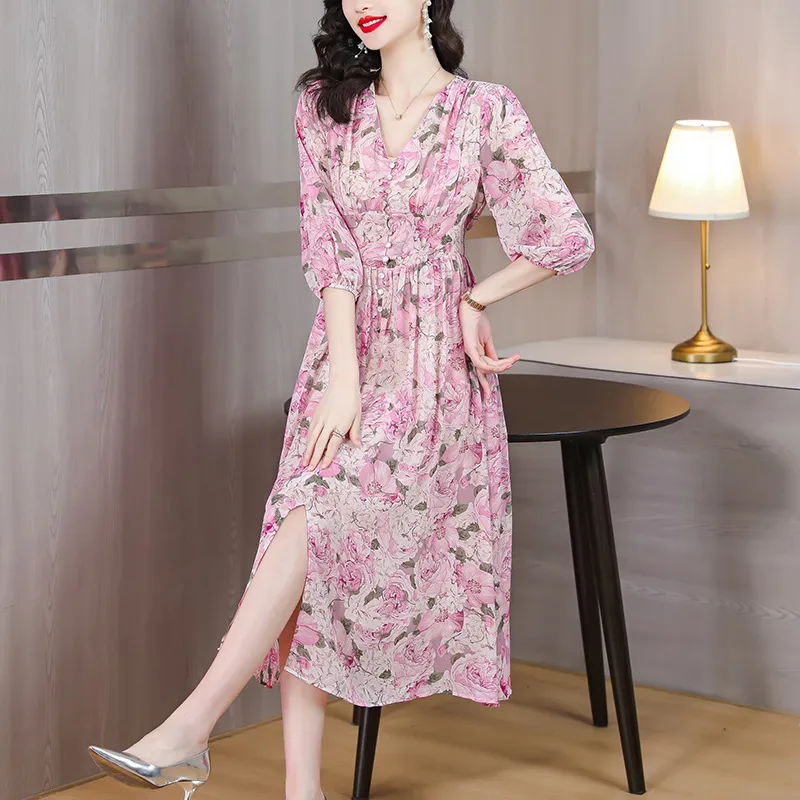衣都精品- 2023新款法式氣質優雅甜美桑蠶絲碎花連衣裙