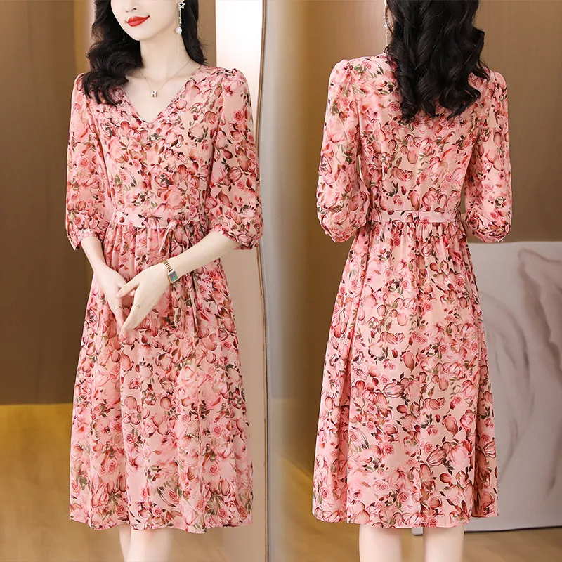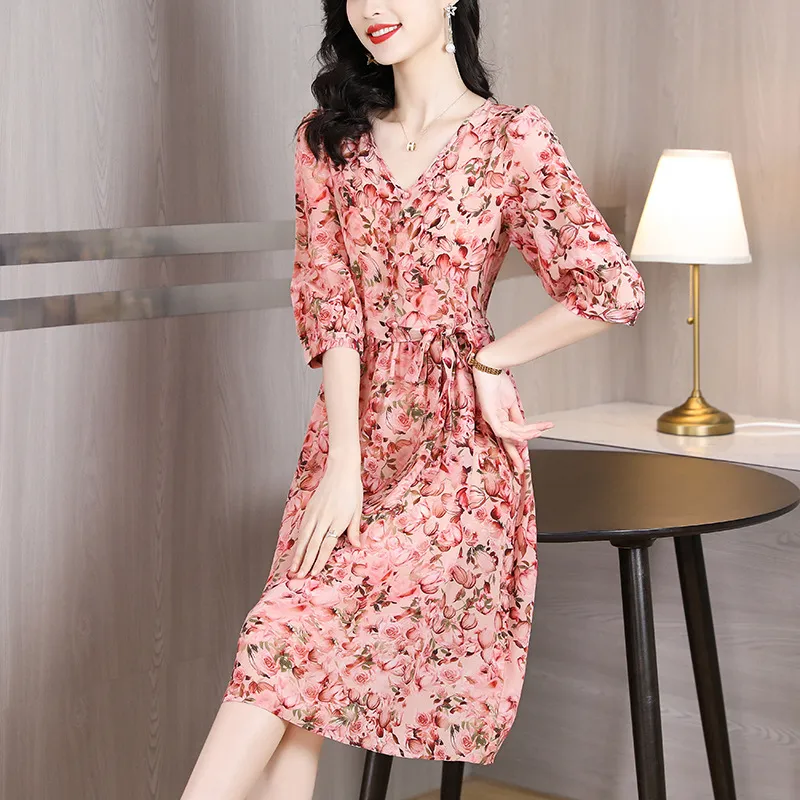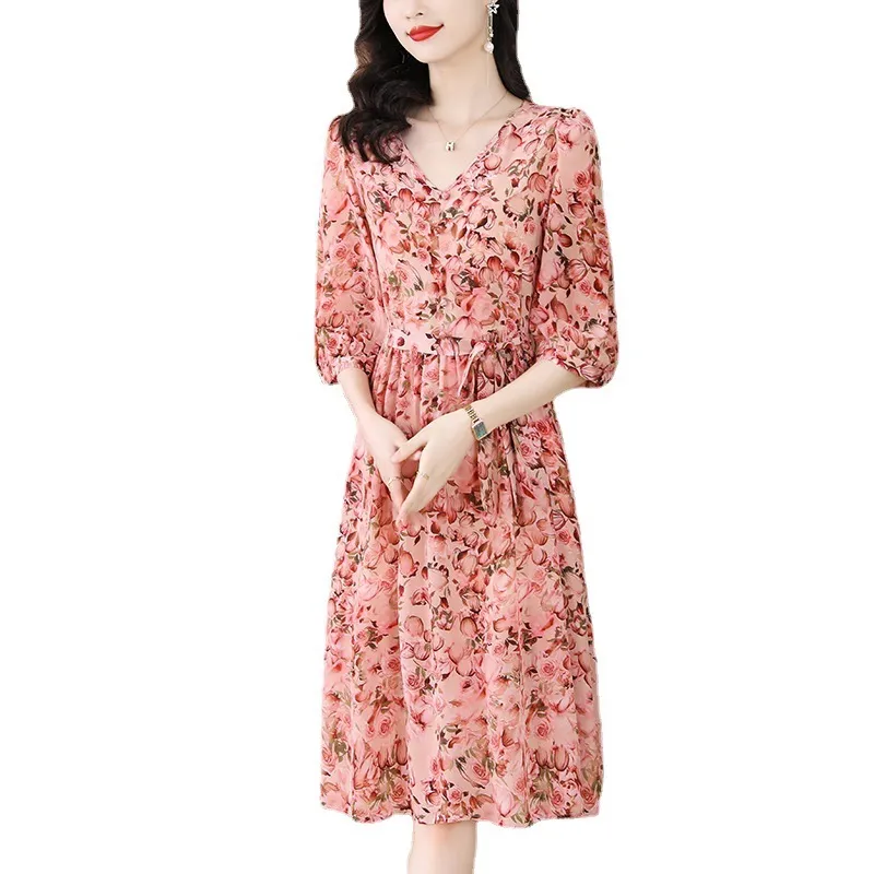 衣都精品- 2023新款時尚優雅V領中長款桑蠶絲印花連衣裙