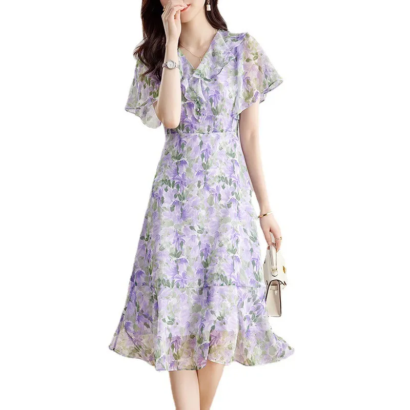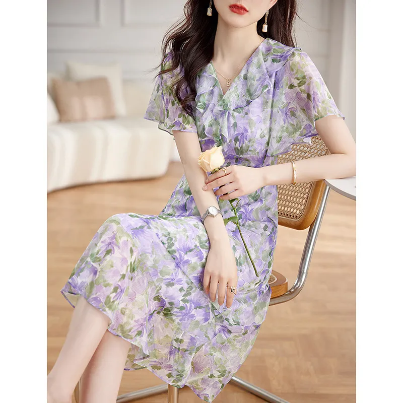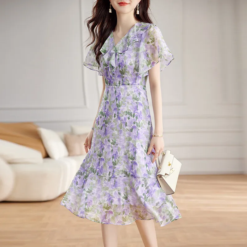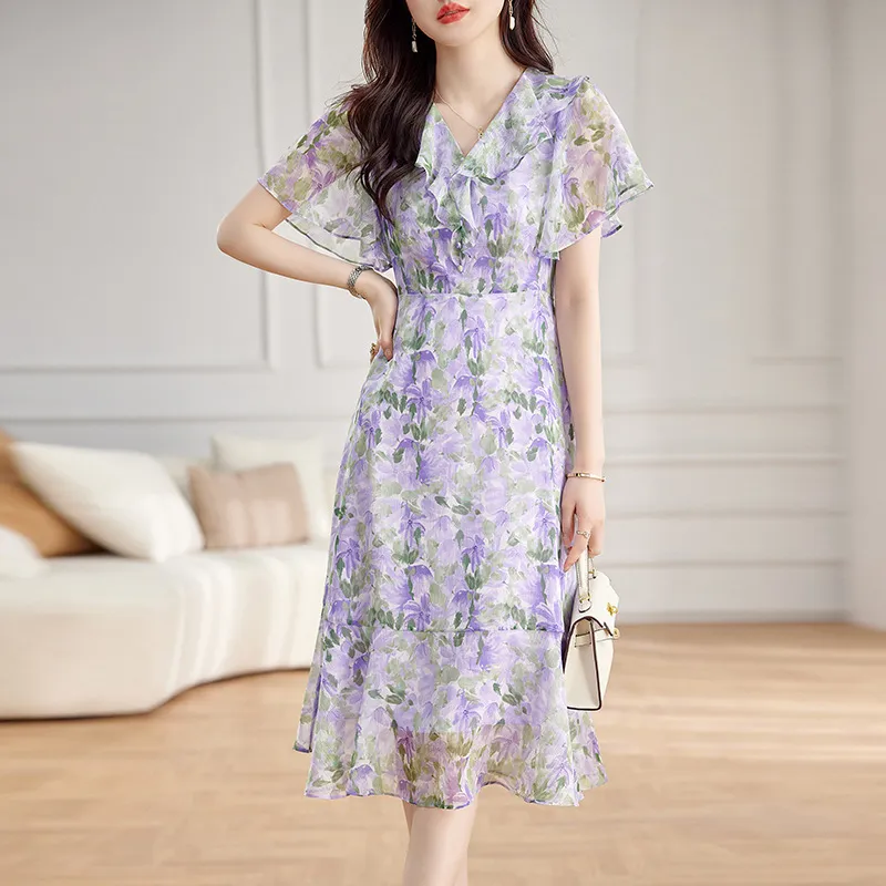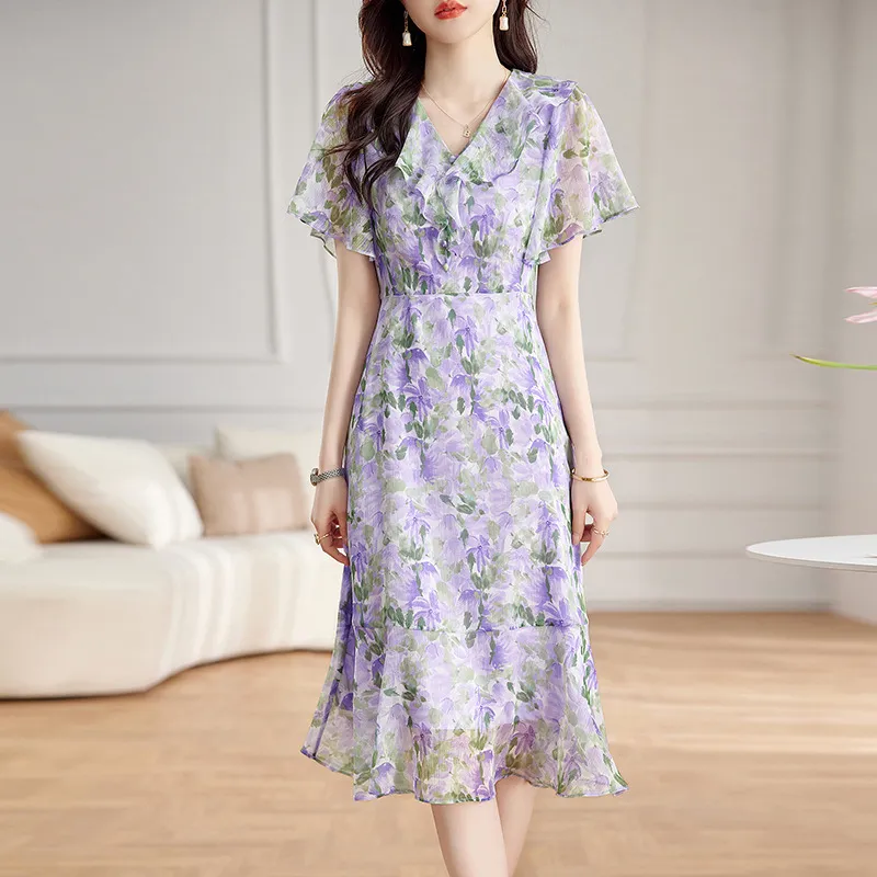 衣都精品- 2023新款時尚優雅V領中長款桑蠶絲印花連衣裙