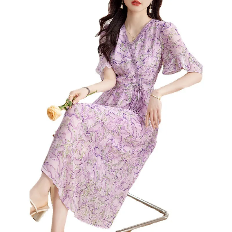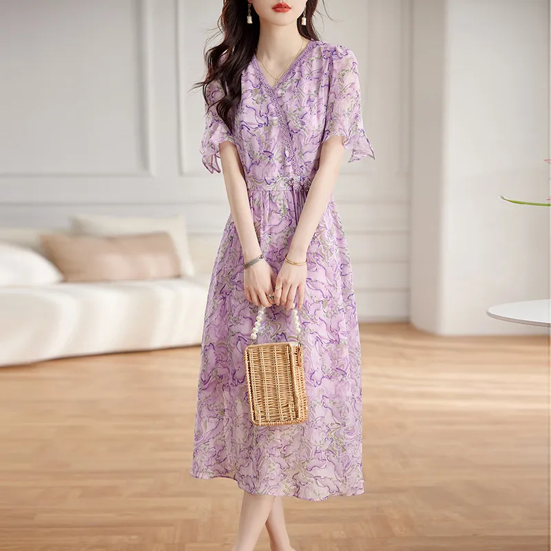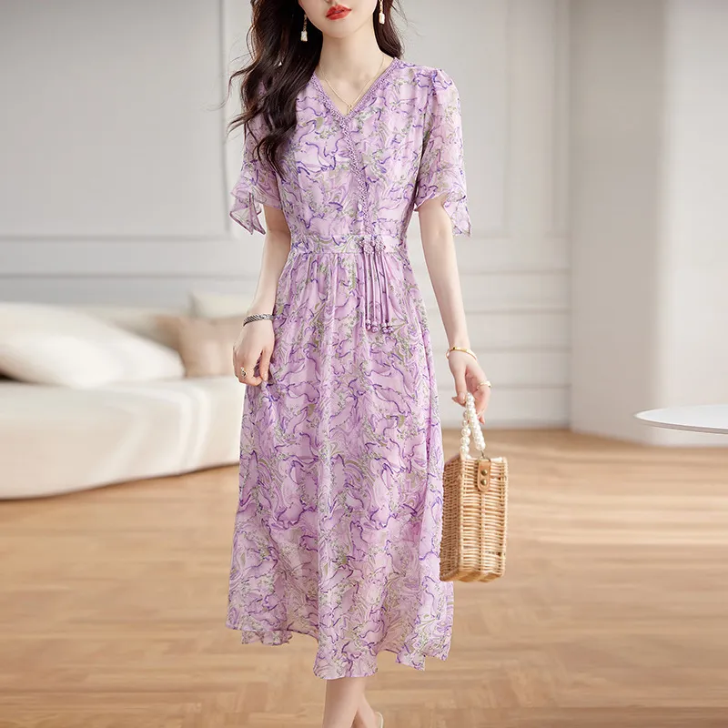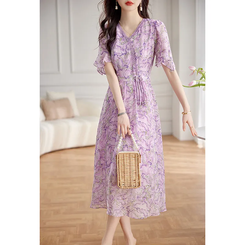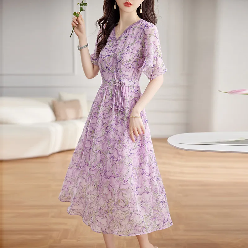 衣都精品- 2023新款時尚優雅V領中長款桑蠶絲印花連衣裙