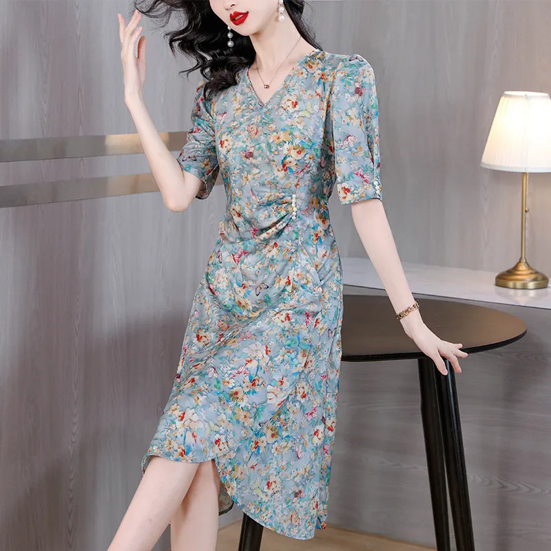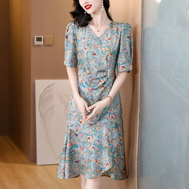 衣都精品- 2023新款復古花色拼接香雲紗印花連衣裙