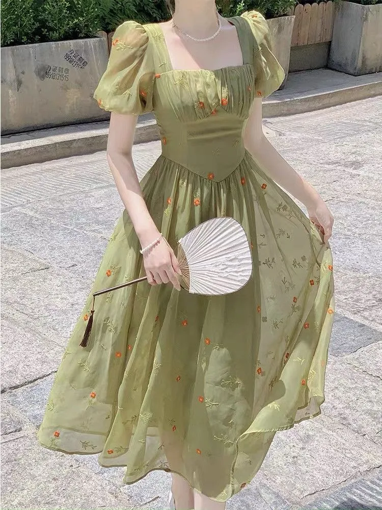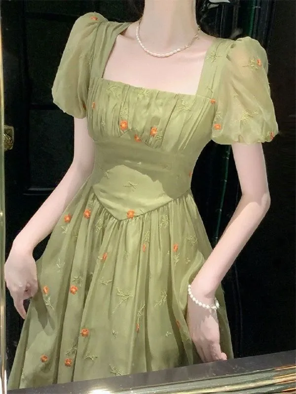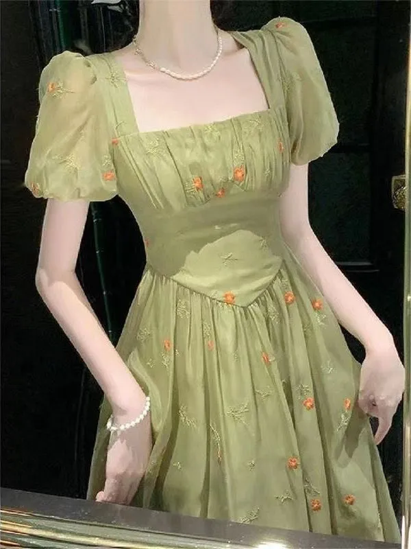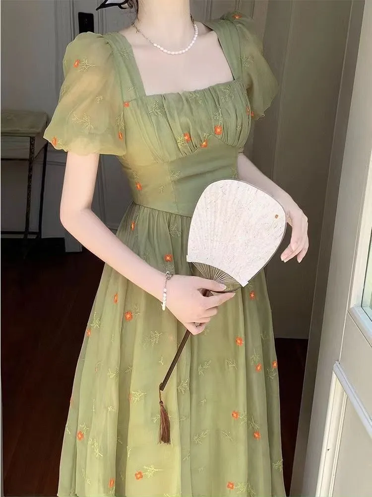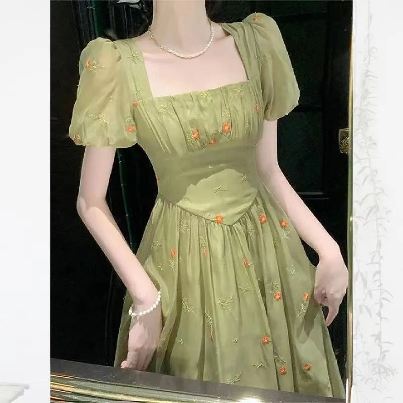 衣都精品- 2023新款收腰顯瘦綠色碎花連衣裙