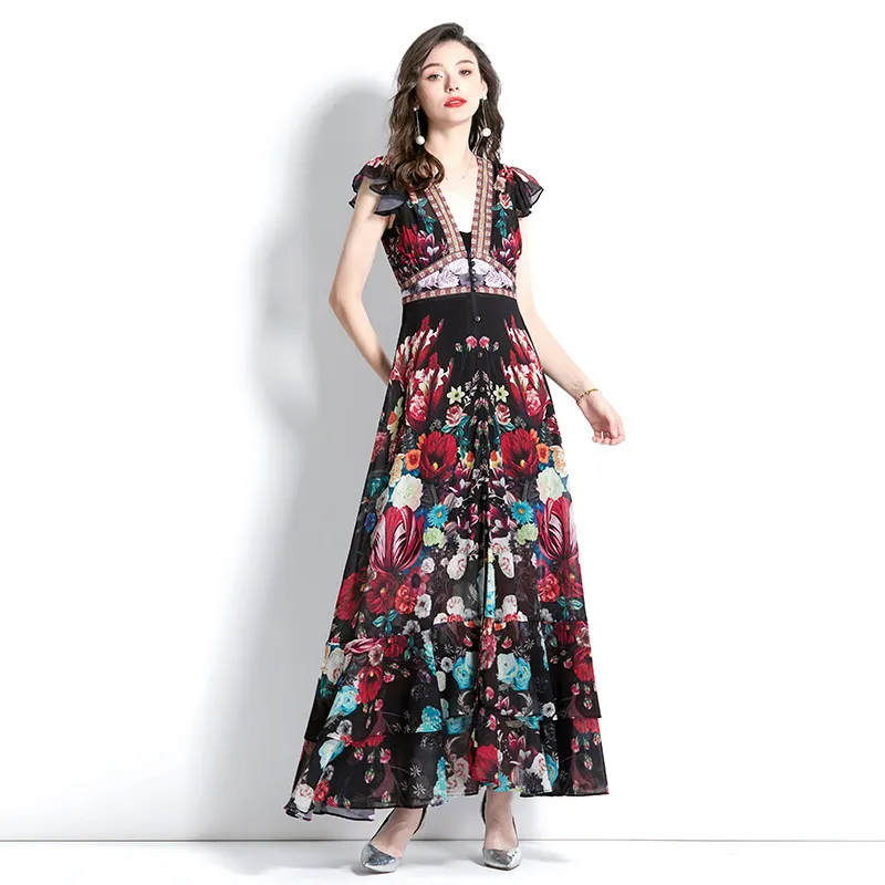 衣都精品- 2023新款V領度假風碎花荷葉邊連衣裙