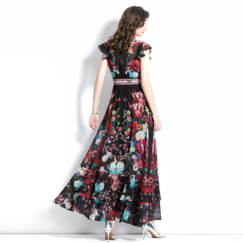 衣都精品- 2023新款復古V領小飛袖波浪邊大擺連衣裙
