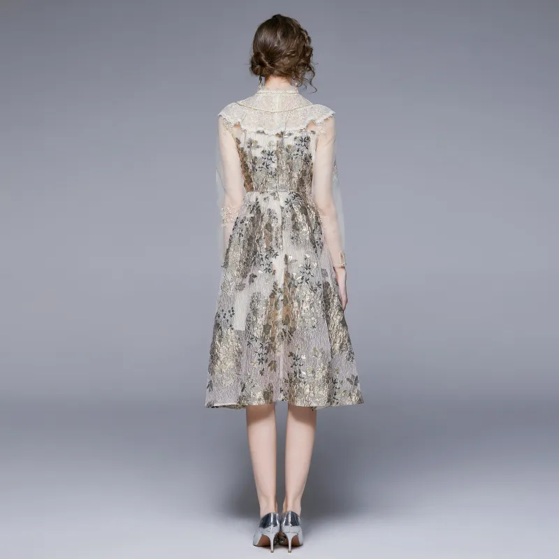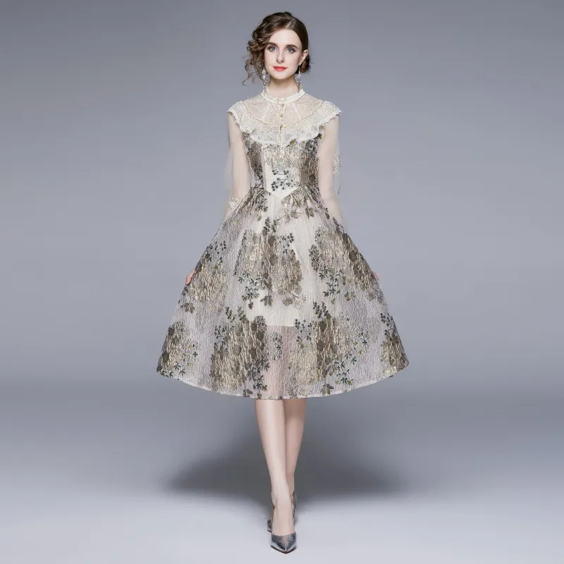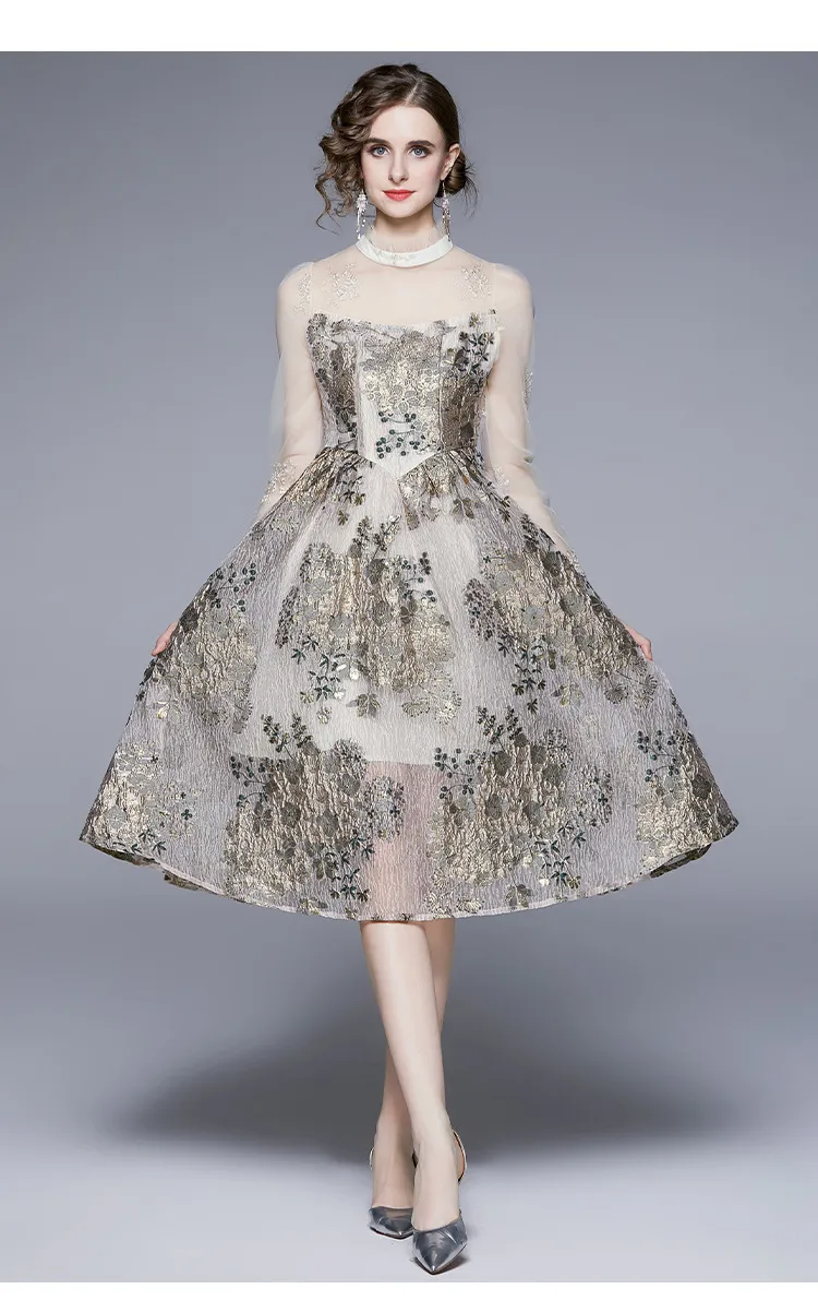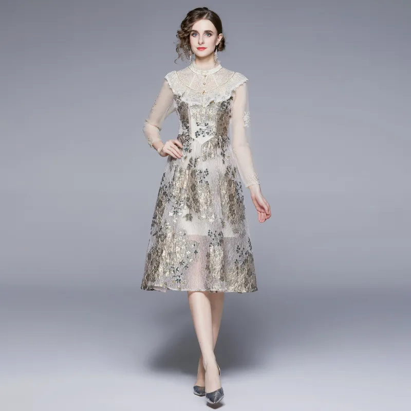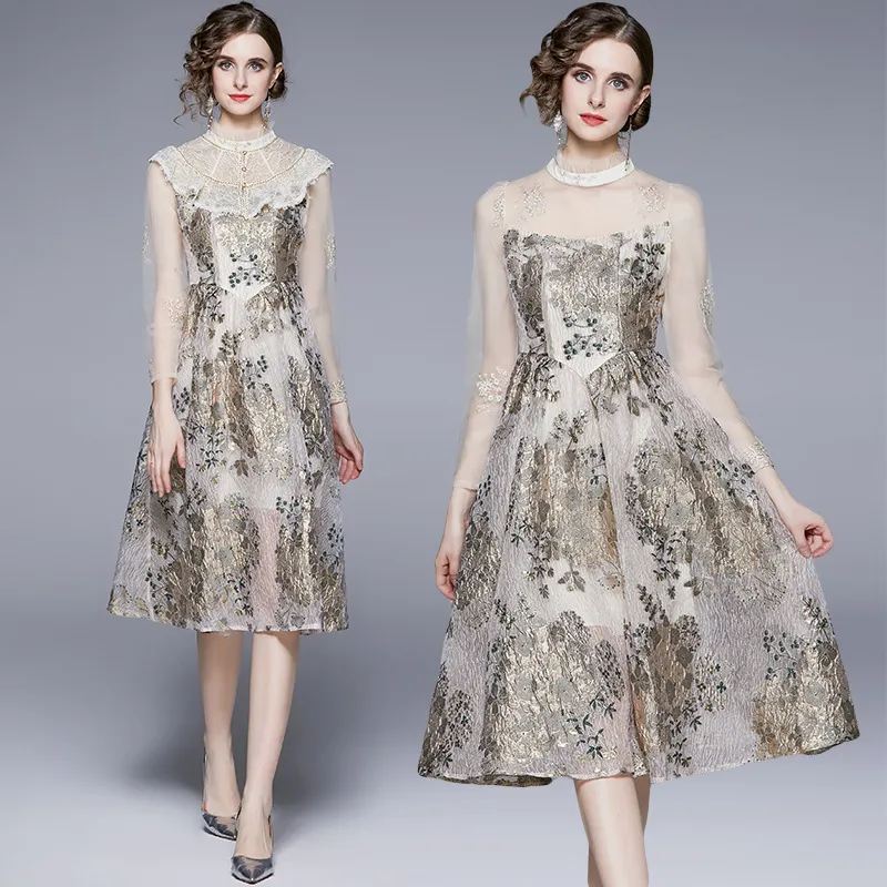 衣都精品- 2023新款時尚復古長袖網紗拼接連衣裙