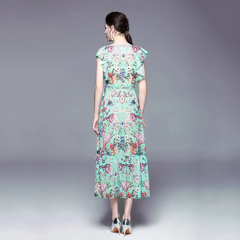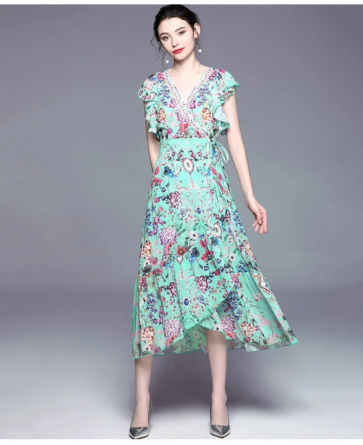 衣都精品- 2023新款復古V領小飛袖波浪邊大擺連衣裙
