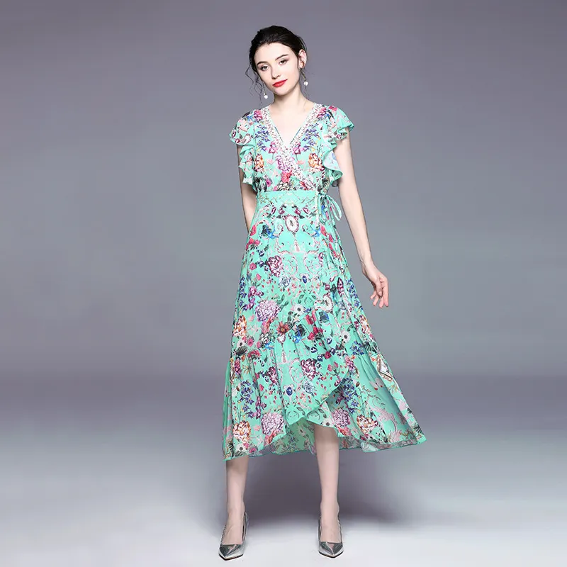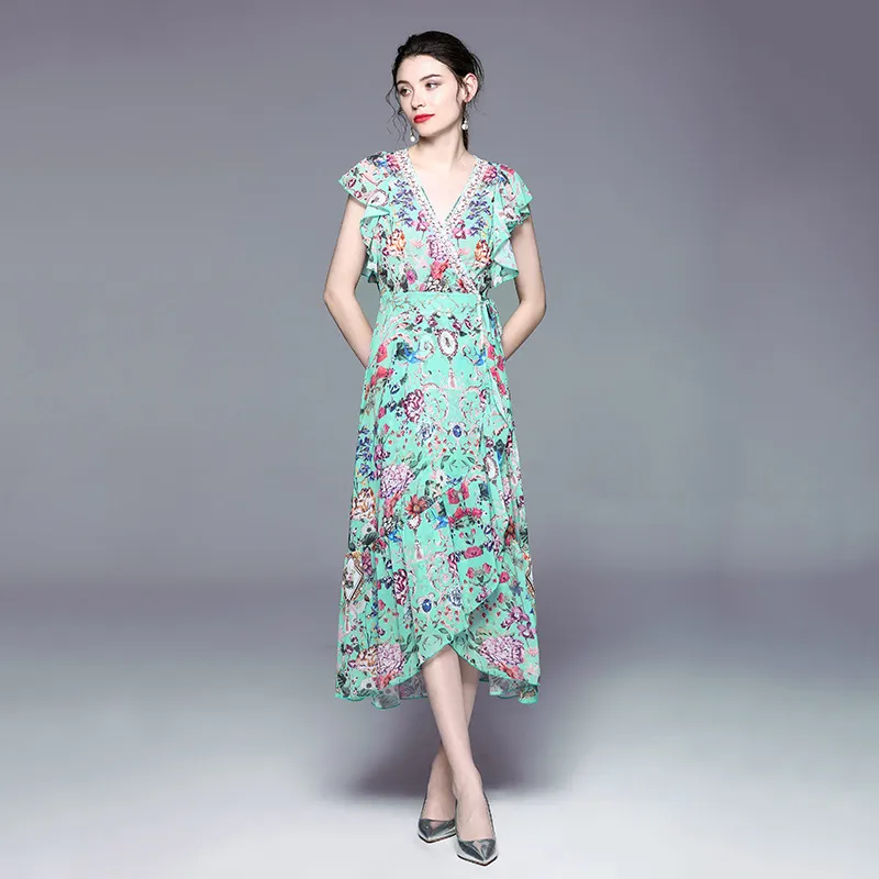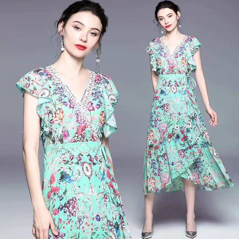 衣都精品- 2023新款不規則繫帶度假風印花連衣裙