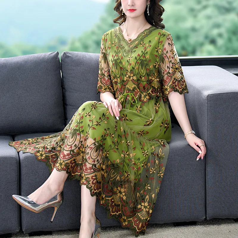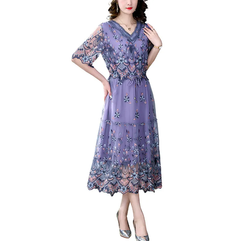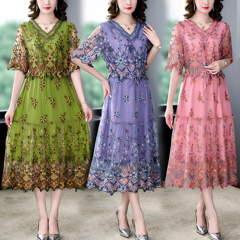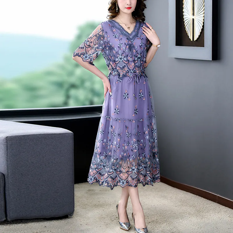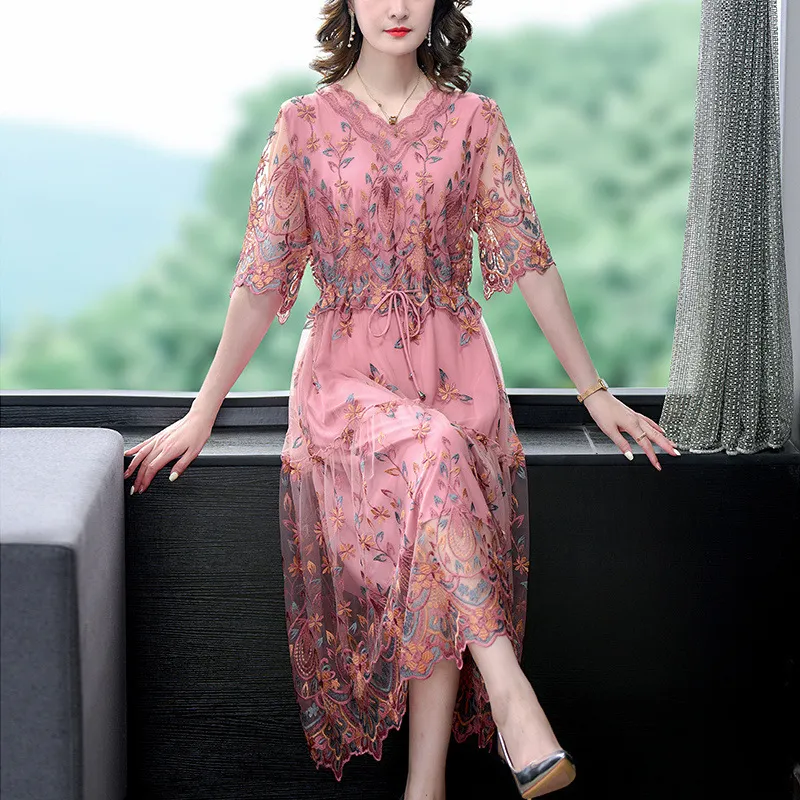 衣都精品- 2023新款氣質優雅V領繡花蕾絲網紗連衣裙