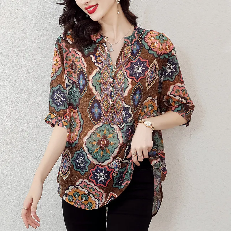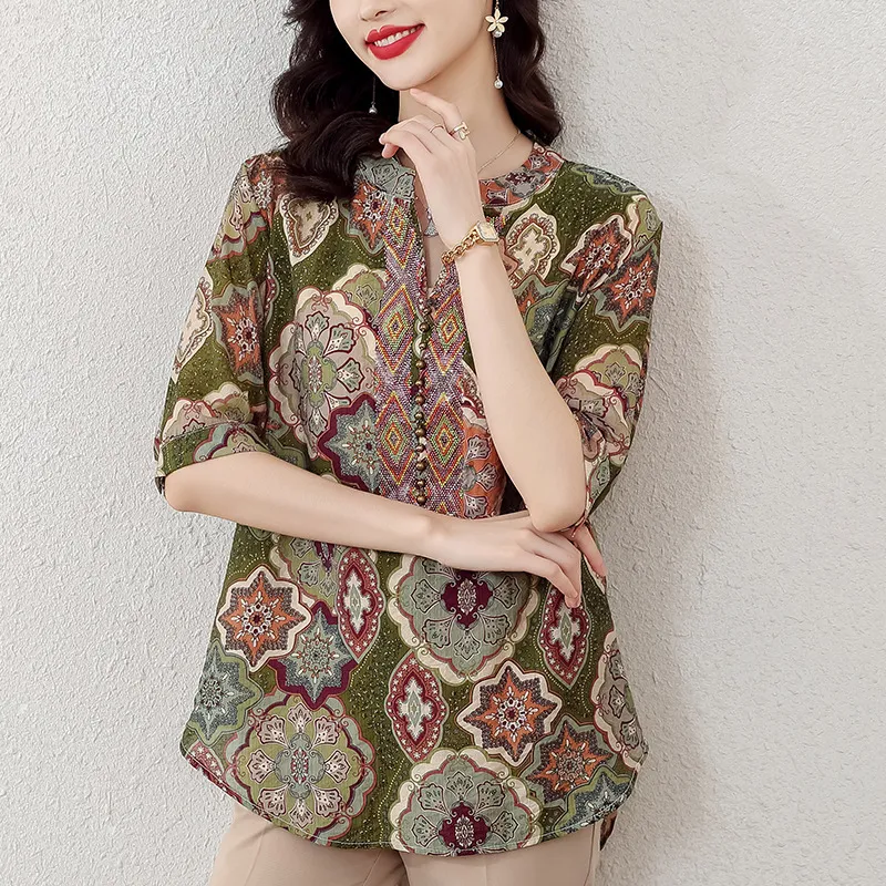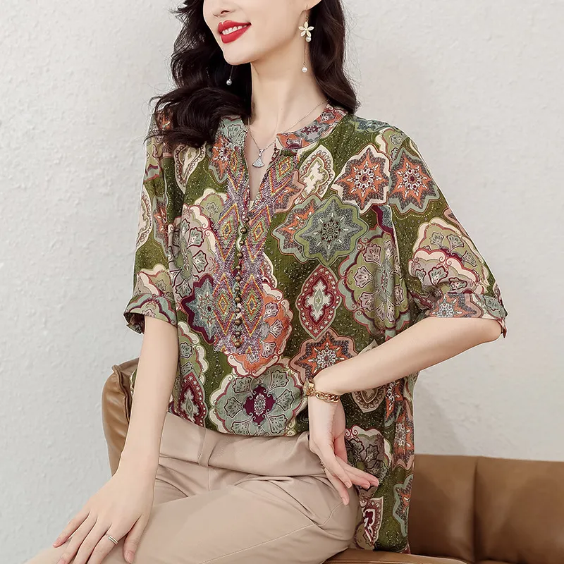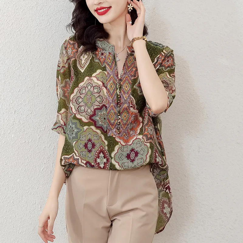 衣都精品- 2023新款重工燙鑽V領減齡印花大碼上衣