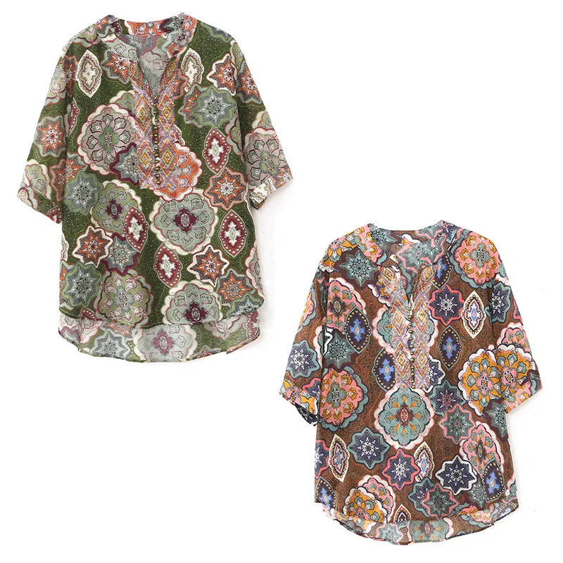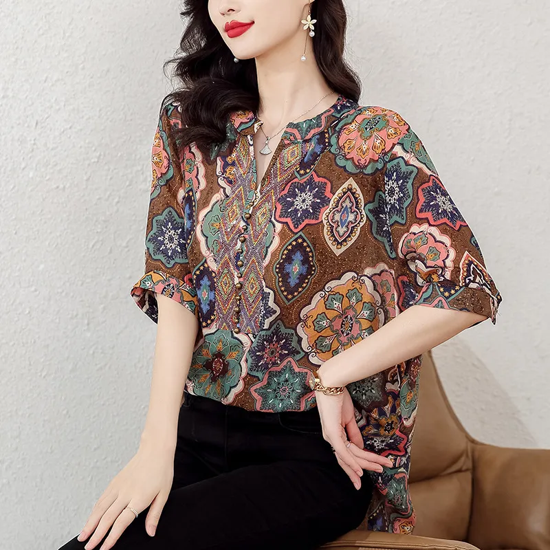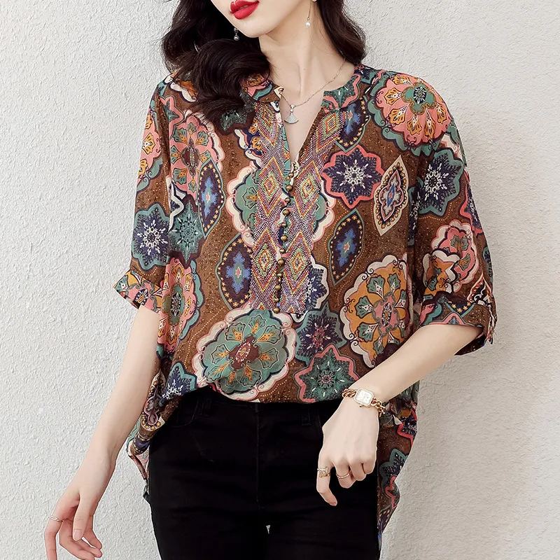 衣都精品- 2023新款時尚復古寬鬆蝙蝠袖印花真絲連衣裙