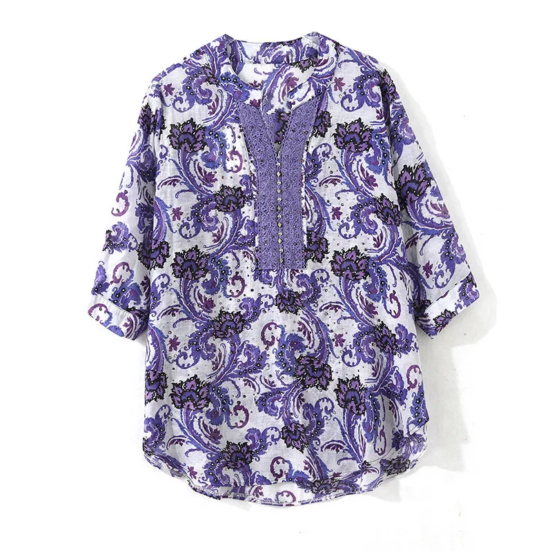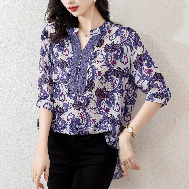 衣都精品- 2023新款重工燙鑽V領減齡印花大碼上衣