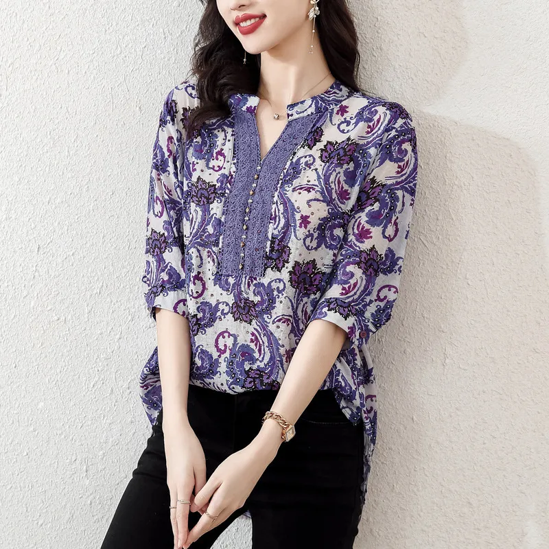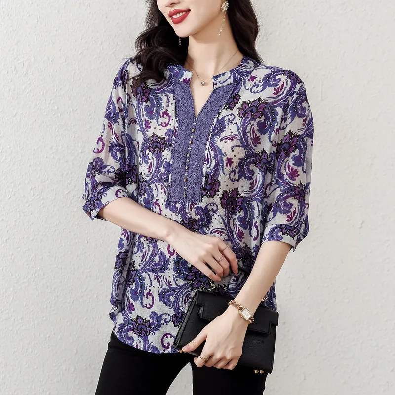 衣都精品- 2023新款燙鑽V領短袖減齡印花大碼上衣