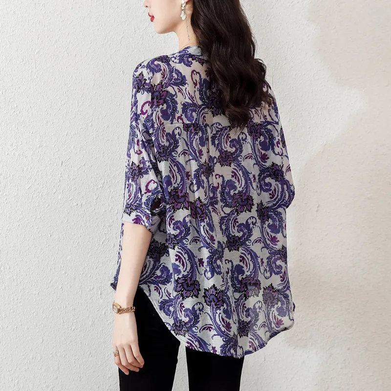 衣都精品- 2023新款時尚復古寬鬆蝙蝠袖印花真絲連衣裙