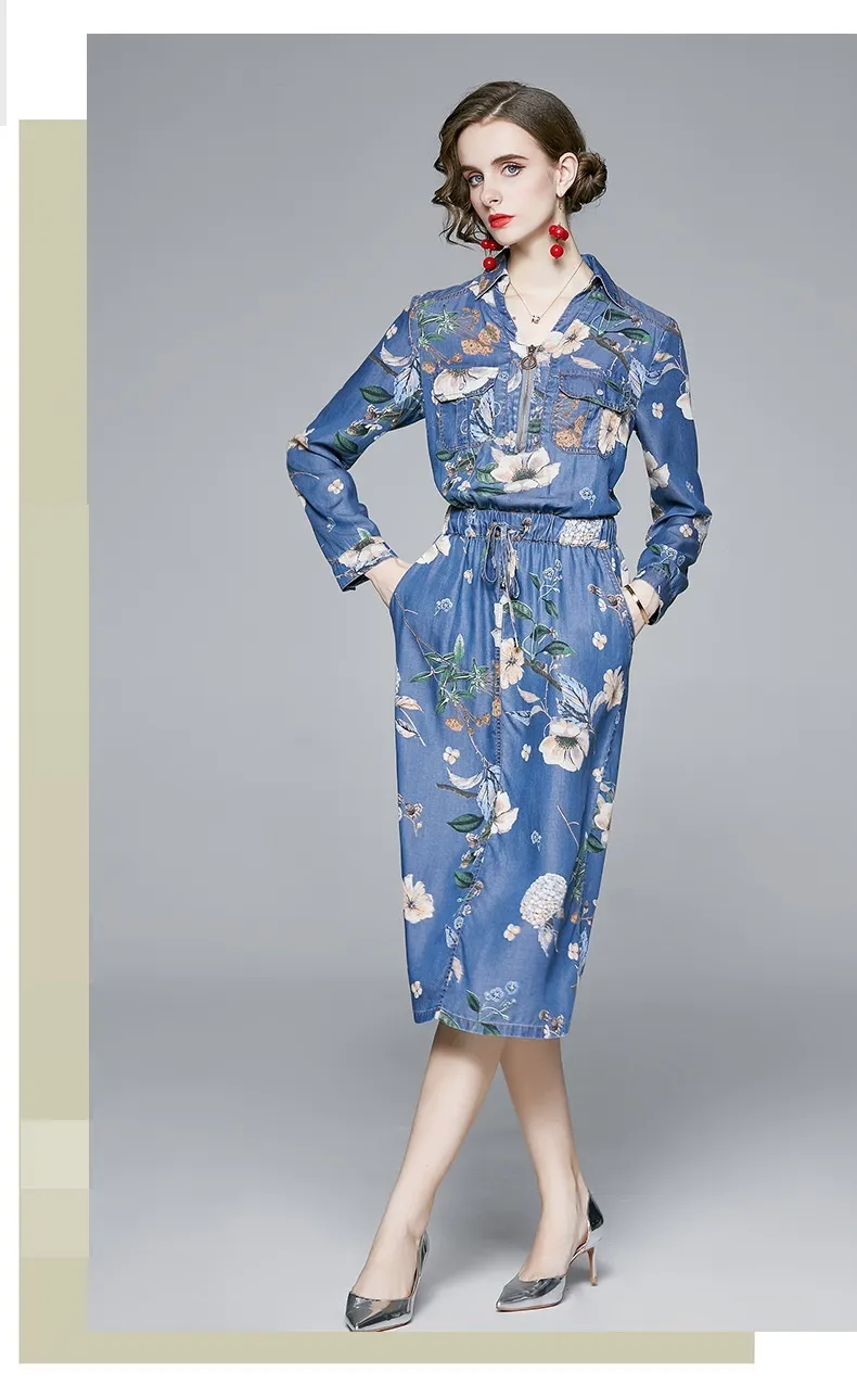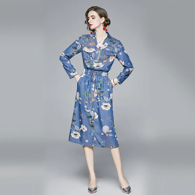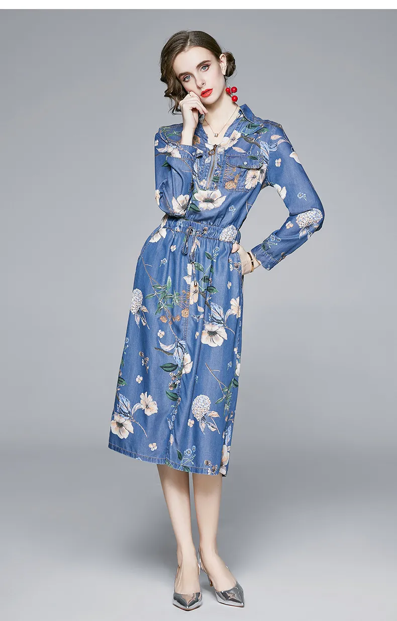 衣都精品- 2023新款時尚牛仔印花修身長袖V領連衣裙