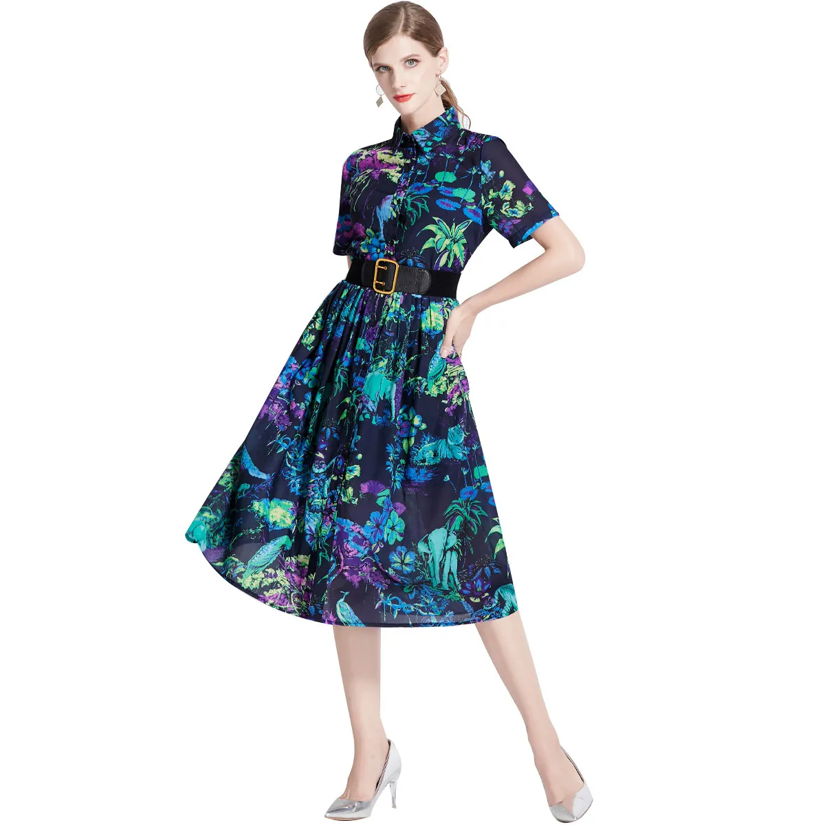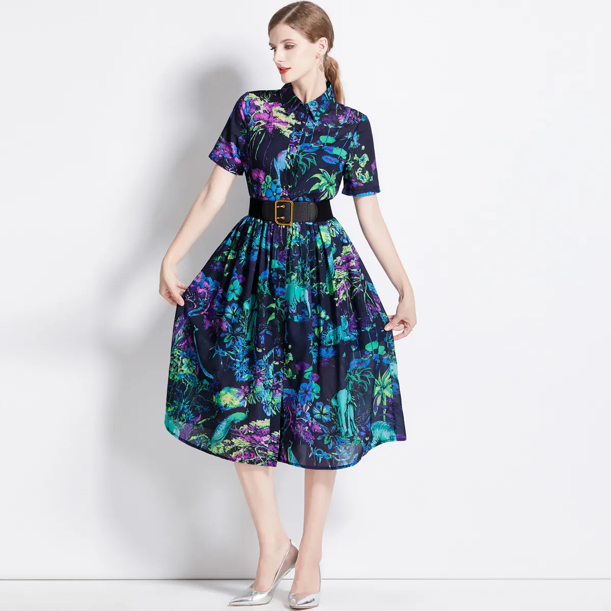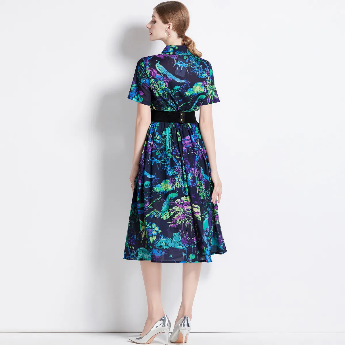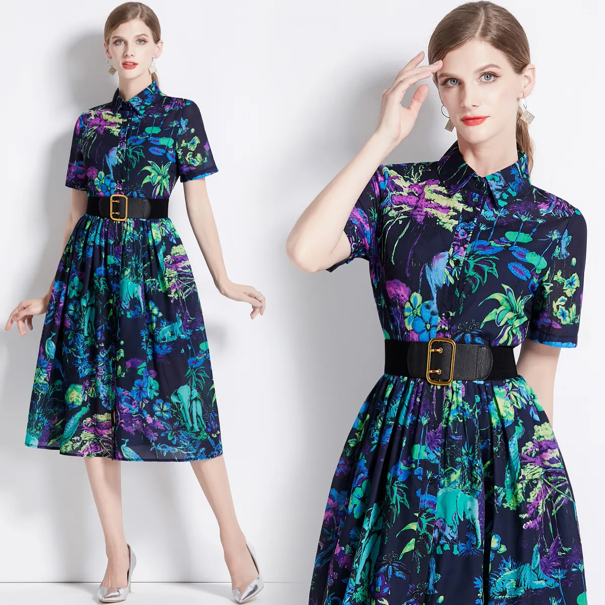 衣都精品- 2023新款時尚復古印花短袖大擺連衣裙